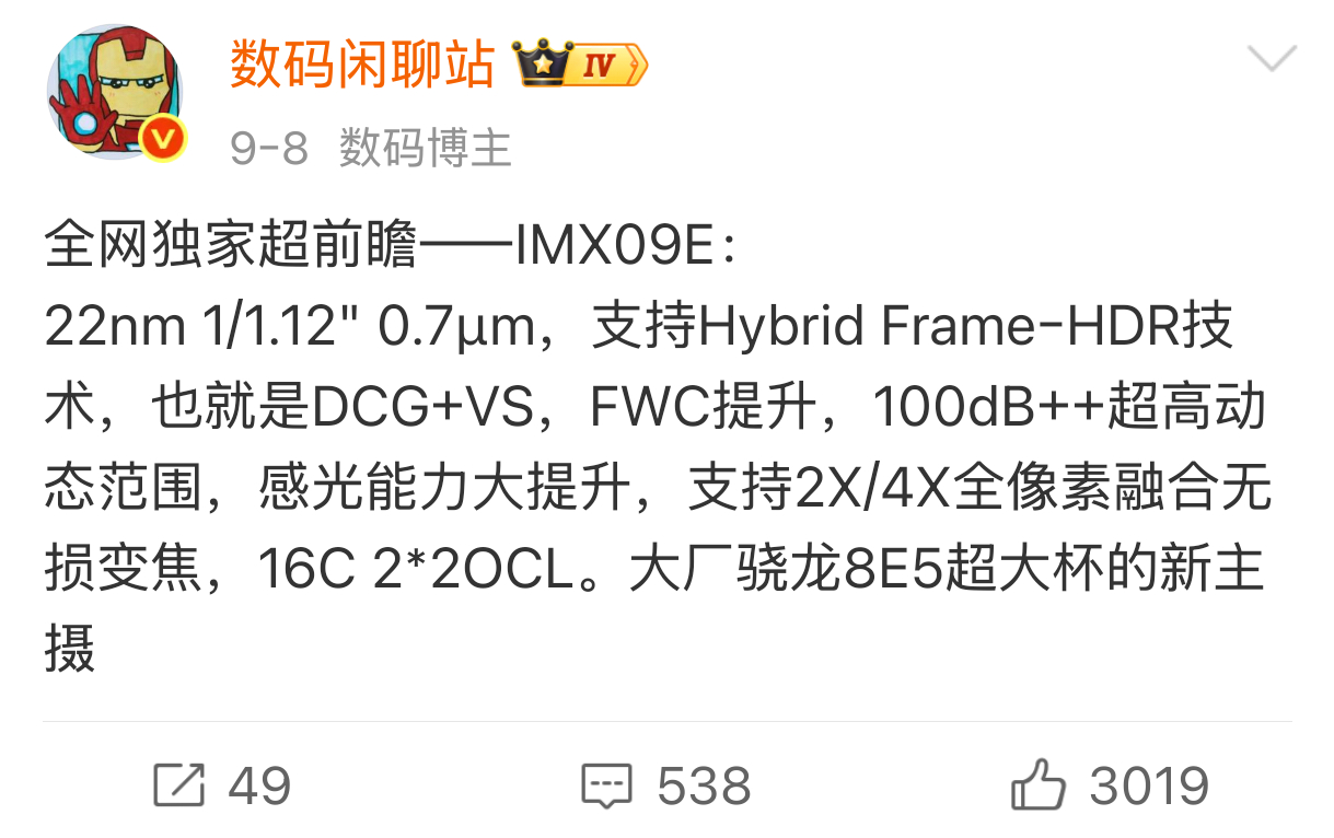 Sony LYT901终于来了,骁龙8E5超大杯主摄:之前独家揭露过的IMX09E,200Mp 1/1.12"超级大底,0.7μm,支持Hybrid Frame-HDR,动态范围100dB+,DCG-HDR+Fine12bit ADC,4X无损变焦,你们猜哪家骁龙8E5超大杯首发?