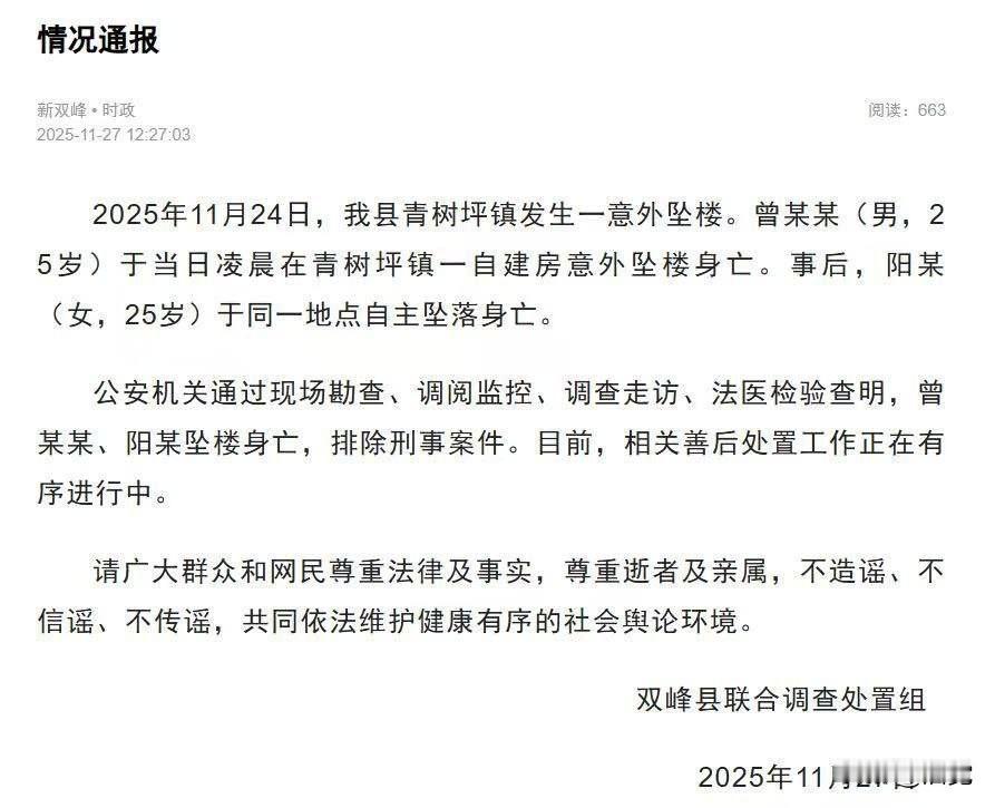 湖南一对恋人结婚前一天 新郎新娘先后坠亡引发广泛的关注 25岁的新郎与相恋五六年的女友 原本定于11月25日举办婚礼 却在24日凌晨发生悲剧 这对苦命鸳鸯不知是何种原因 以这种方式结束自己的生命 双峰县联合调查处置组发布情况通报 新郎是先走的 随后新娘也随之而去 看到这样的消息 让人心疼不已 死亡都不畏惧 何以畏惧生活呢