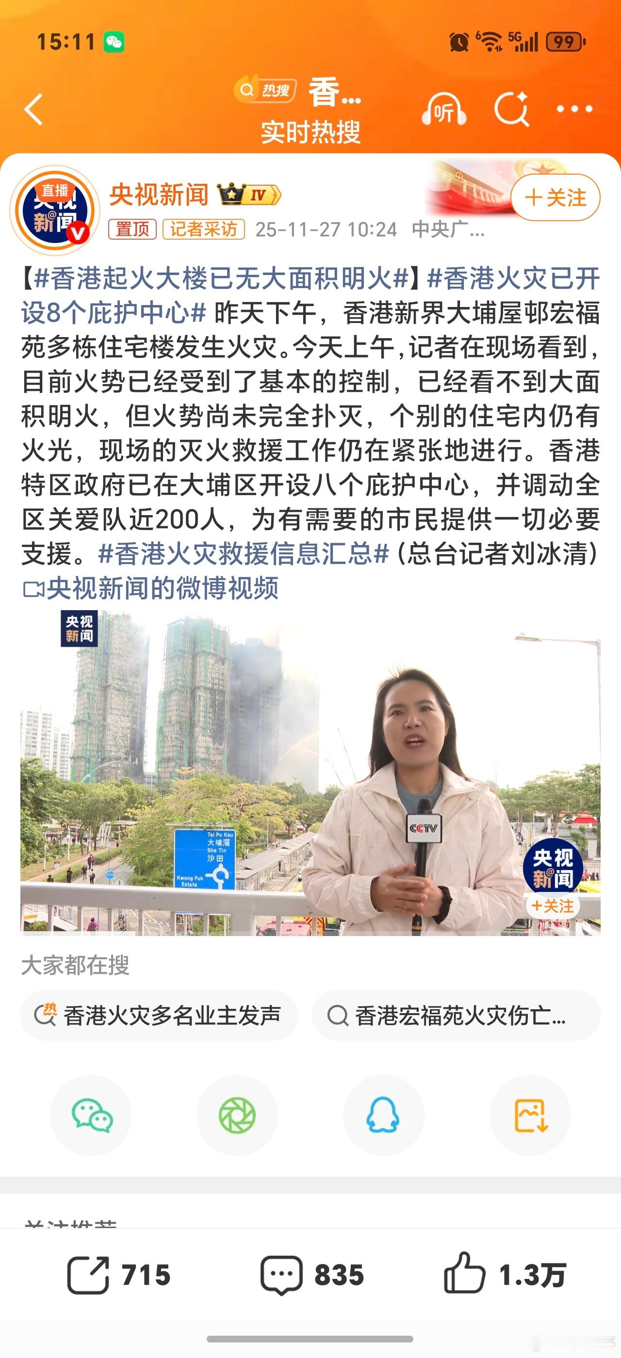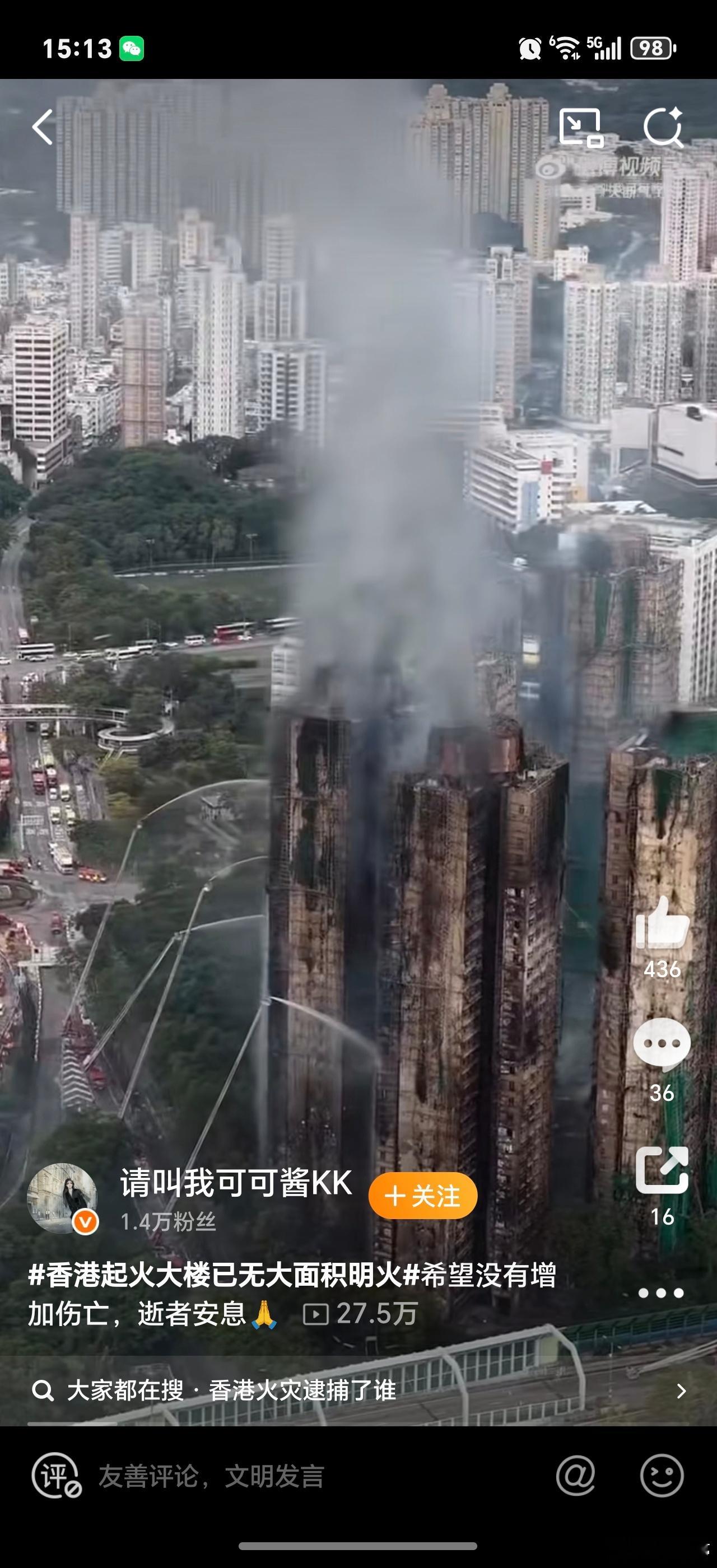 香港起火大楼已无大面积明火昨天到今天这么久了,大面积明火基本不存在了!希望人员伤亡不要继续增加!整体感知香港这楼与楼确实太密集了;而且竹枝脚手架确实该淘汰了!