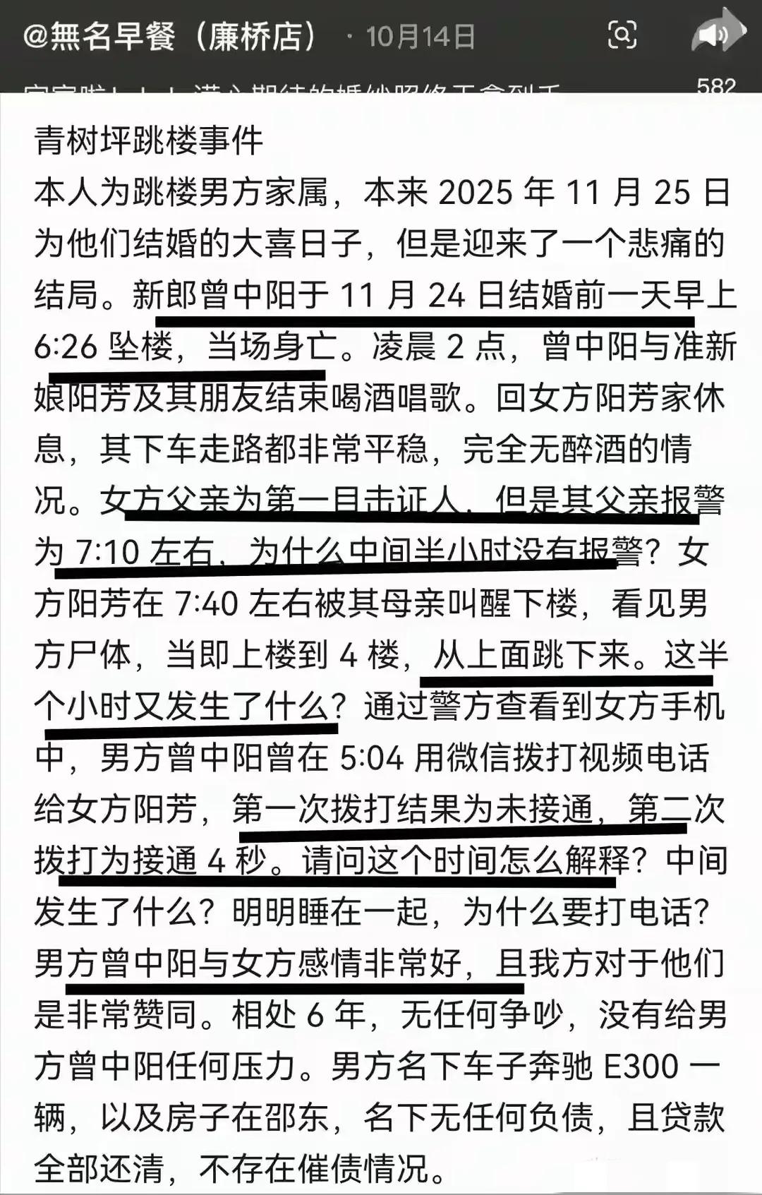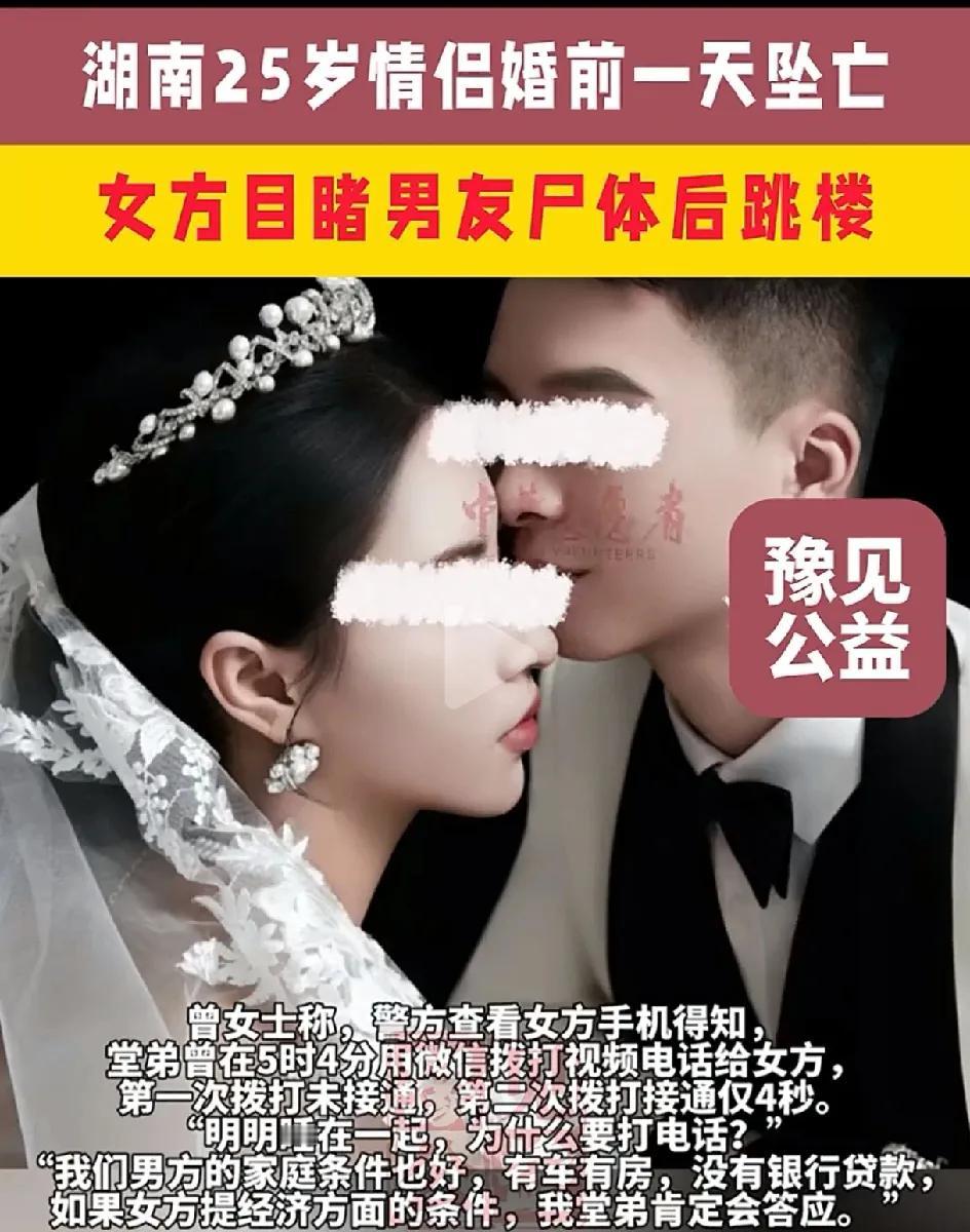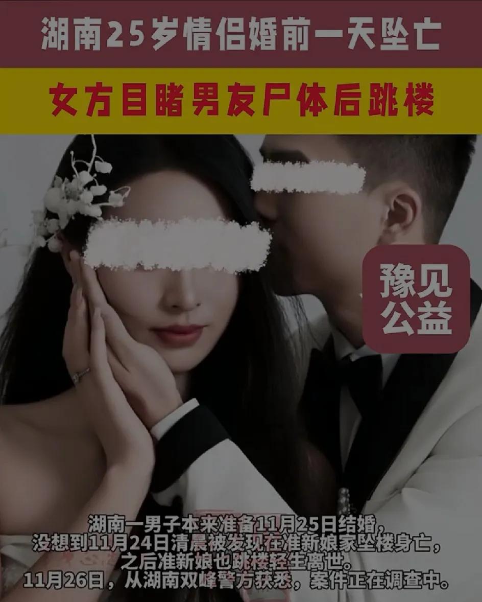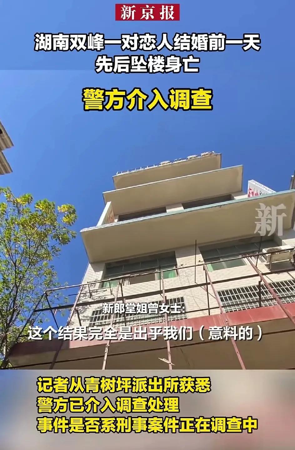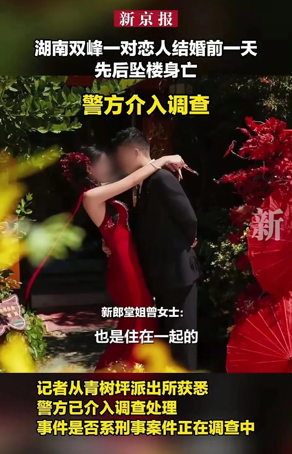 新郎新娘婚前一天相继坠楼。男方是意外,女方自主坠落。女方的父亲第一个发现现场。男方家庭条件优越,开了三个早餐店,有车有房,无债。与女方感情好,相处6年从未争吵。男方6:26坠楼。5:04男方用微信拨打视频电话给女方。第一次未接通,第二次通话4秒。女方的父亲7:10报警,女方的母亲7:40把女儿叫醒到楼下。女方看到男方的情况后,跑到4楼自主跳下。这期间到底发生了什么?等待官方通报。