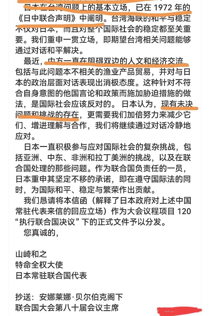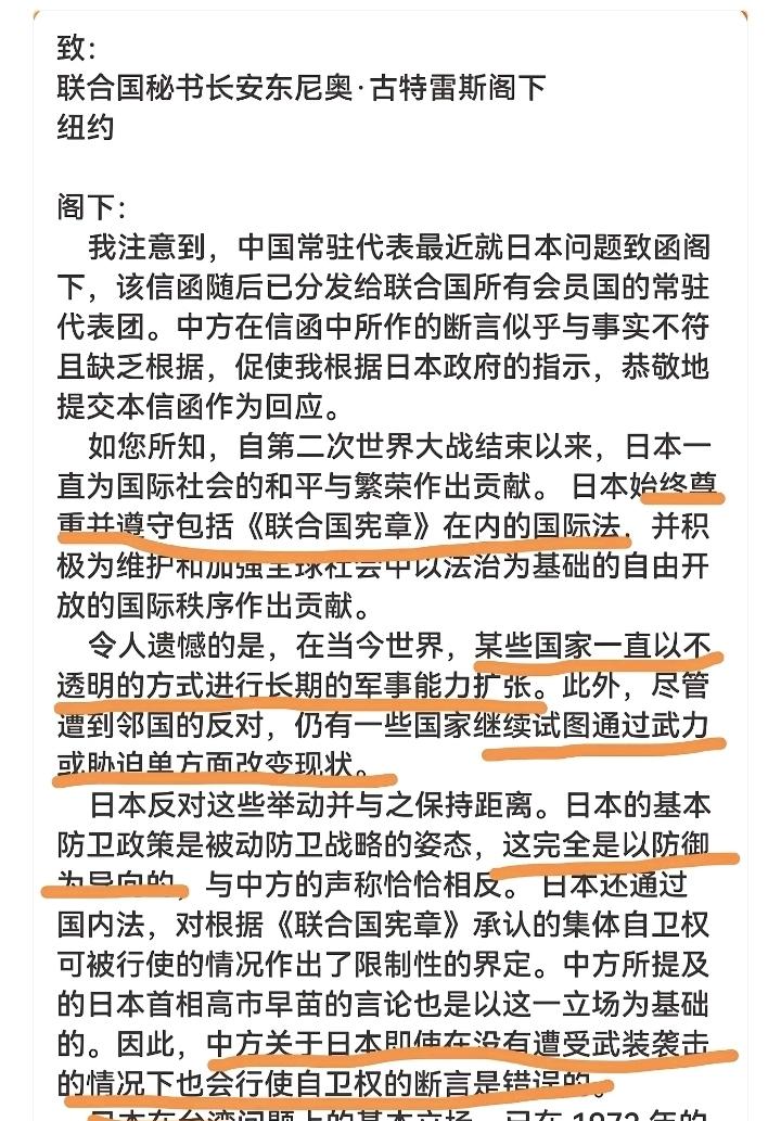 这是日本驻联合国代表,发给联合国秘书长古铁雷斯的公函, 拜读完全文,我充分体会到了什么叫避重就轻、偷换概念, 这次中日之争,完全是由于高市早苗对中国武力威胁引起的,引发中国愤怒的“台湾有事,日本有事”,这八个大字,这位代表提也不提, 高市早苗说的“中国军舰进入台湾,自卫队就将介入”这些话,这个代表也不敢说, 这篇公函,拉拉杂杂的说了大量的废话,最关键的东西,坚决不吱声, 这样的公函,除了卑鄙无耻,实在想不起别的形容词。