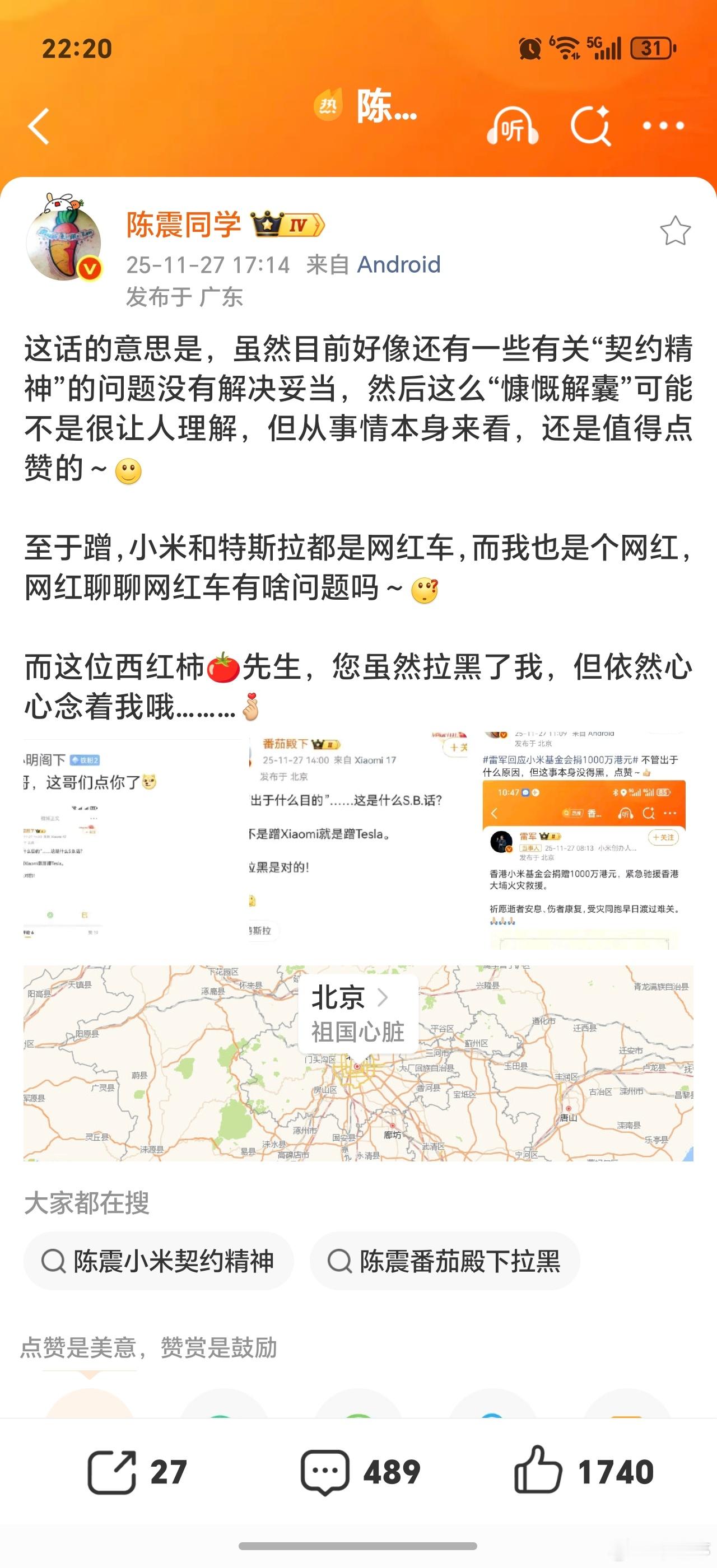 陈震 小米陈震小米又被冲上热搜了,原因是陈震评论小米捐款事件,米粉觉得陈震在阴阳。随后陈震解释,是关于一些“契约精神”的问题没解决妥当,不是很让人理解!但捐款事情本事值得点赞。大家这波认可谁的观点?