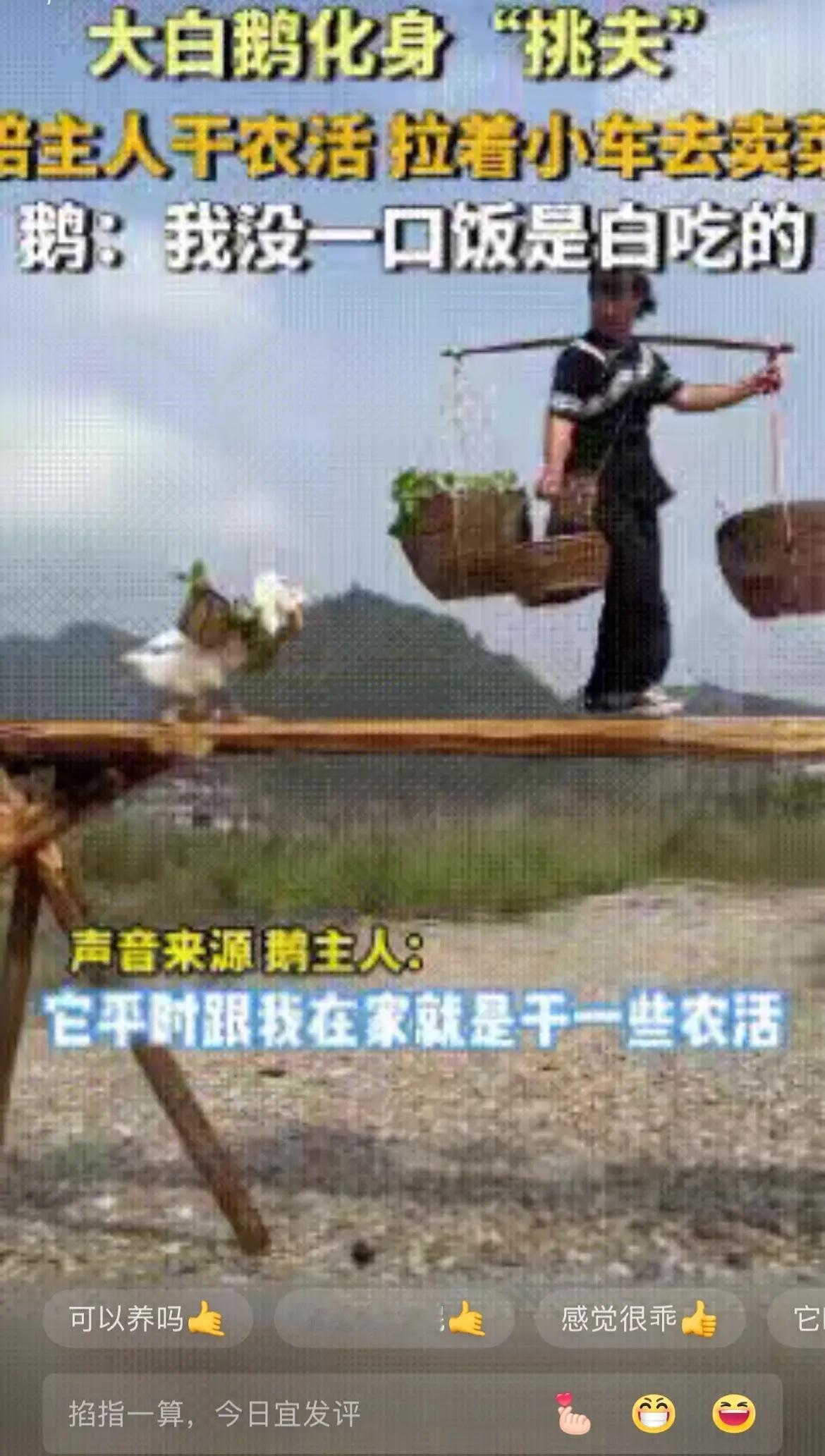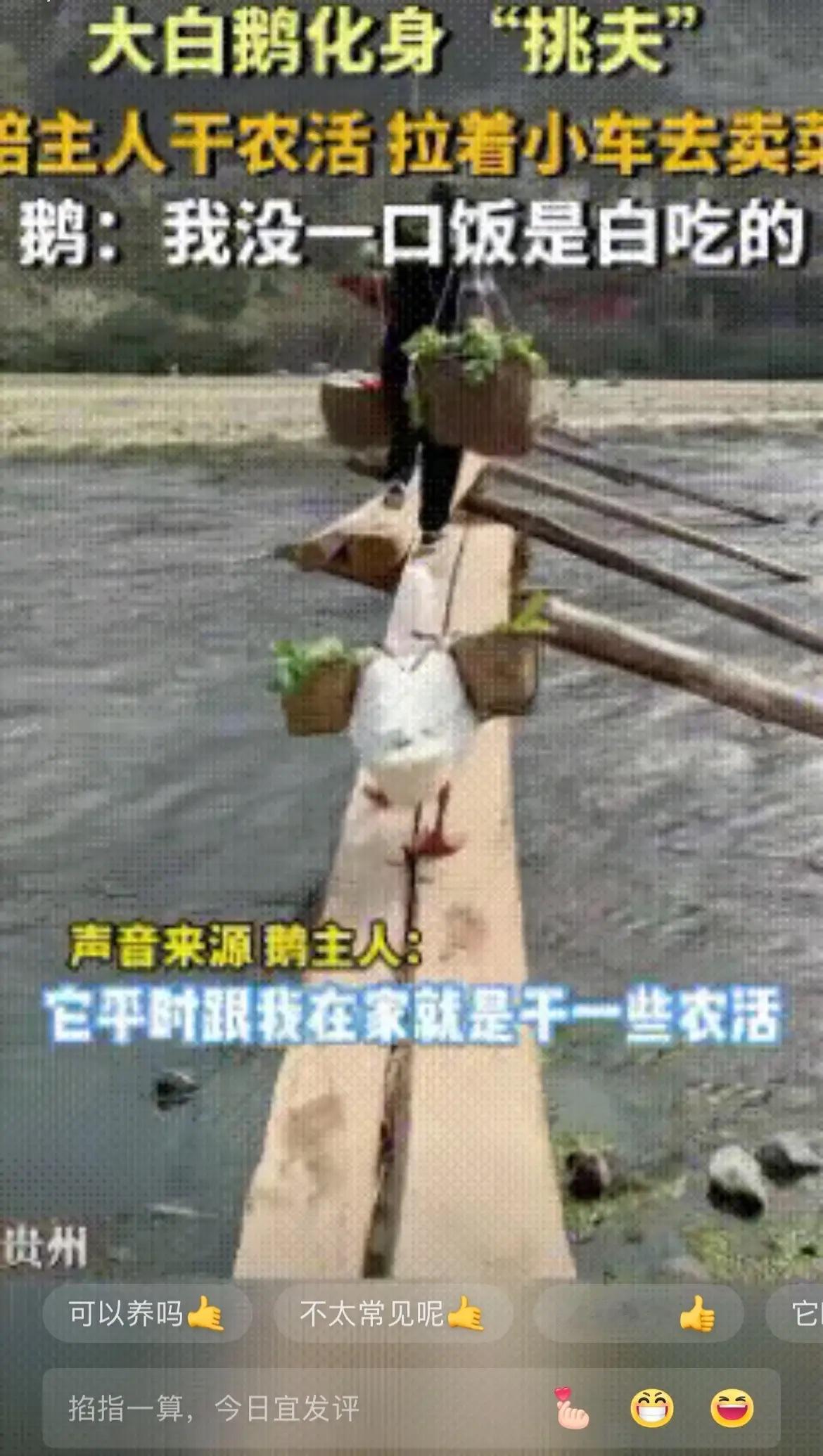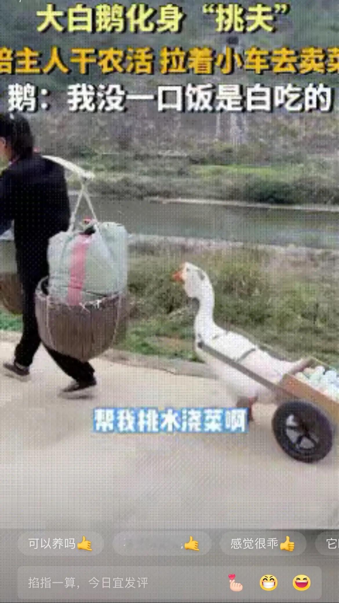 这只鹅太可爱了!一大白鹅化身“挑夫”,陪主人干农活,拉着小车去卖菜,还帮忙看家护院,每天都不厌其烦,乐在其中,鹅:我没有一口饭是白吃的。网友:在我们东北早都铁锅炖大鹅了。 网友的调侃带着东北人的幽默,刷到视频时我忍不住笑出声,但笑着笑着又觉得心里发暖。这只大白鹅不是什么名贵品种,就是农村最常见的土鹅,羽毛雪白雪白的,脖子伸得老长,拉着的小车是主人用废旧木板钉的,轮子还是塑料的,走起来“咕噜咕噜”响。每天天刚亮,主人收拾好青菜,把绳子一端系在鹅的脖子上,另一端固定在小车前端,它就知道要出发了,不用催也不用赶,迈着稳健的步子往村口的集市走。遇到上坡路,它会把脖子绷得更紧,翅膀微微张开,像是在用力发力,主人想帮它推一把,它还会扭过头,用脑袋轻轻蹭蹭主人的手,仿佛在说“我能行”。 村里的人都认识这只“干活鹅”,每次见了都会跟它打招呼,有的还会拿出自家的玉米粒喂它。它也不挑食,吃完了就继续往前走,遇到调皮的小孩想摸它的羽毛,它会轻轻啄一下对方的手背,力道不大,就是提醒对方别捣乱。到了集市,主人摆摊卖菜,它就守在旁边,昂首挺胸,像个警卫员,有人想趁机拿一把菜就走,它立马伸长脖子“嘎嘎”叫着冲过去,吓得对方赶紧把菜放下。有一次,一个小偷趁着主人不注意,想偷车上的零钱,刚伸手就被它啄了手腕,疼得小偷嗷嗷叫,周围的摊主都拍手叫好,说这只鹅比狗还管用。 其实农村养鹅的农户不少,但大多是为了吃鹅蛋或者吃肉,像这样把鹅当成“劳动力”的并不多。这只鹅之所以这么通人性,说到底还是主人待它好。主人从来没打过它,也没饿过它,冬天天气冷,会给它的窝铺上干草,夏天天热,会给它搭遮阳棚,还会把剩下的米汤拌着麦麸喂它。动物都是有灵性的,你对它好,它自然会用自己的方式回报你。这只鹅每天干完活,回到家就会趴在主人脚边,主人摸它的头,它会闭上眼睛,一副很享受的样子,有时候还会用脖子卷住主人的腿,撒个娇。 有人说,这只鹅是“卷王”,连鹅都知道要努力干活才有饭吃,何况是人。这话确实有道理,现在很多人总想着躺平,遇到一点困难就退缩,对比这只鹅,真的该反思一下。它没有复杂的心思,就知道踏踏实实干活,用自己的力气换一口饭吃,这种简单又纯粹的坚持,反而让人敬佩。还有网友说,要是所有的鹅都这么能干,谁还舍得吃铁锅炖大鹅。其实这话也说出了很多人的心声,当你看到一只鹅如此忠诚、如此勤劳,真的很难再把它和食物联系在一起。 现在这个视频在网上火了,很多人都被这只鹅圈粉了,有人说想养一只这样的鹅,有人说要给它颁发“最佳员工奖”。其实大家喜欢的不仅仅是这只鹅本身,更是它身上那种勤恳、忠诚的品质,还有主人与鹅之间那种相互陪伴、相互信任的感情。在这个快节奏的社会里,人与人之间的关系有时候变得很复杂,而动物的陪伴往往更简单、更治愈。 这只大白鹅用自己的行动告诉我们,不管是动物还是人,只要用心付出,就一定会有回报。它没有惊天动地的壮举,只是日复一日地陪着主人干活、看家,却用最朴素的方式温暖了很多人。生活本来就是由这些平凡的小事组成的,而正是这些小事,才让我们的生活变得有温度、有意义。 各位读者你们怎么看?欢迎在评论区讨论。