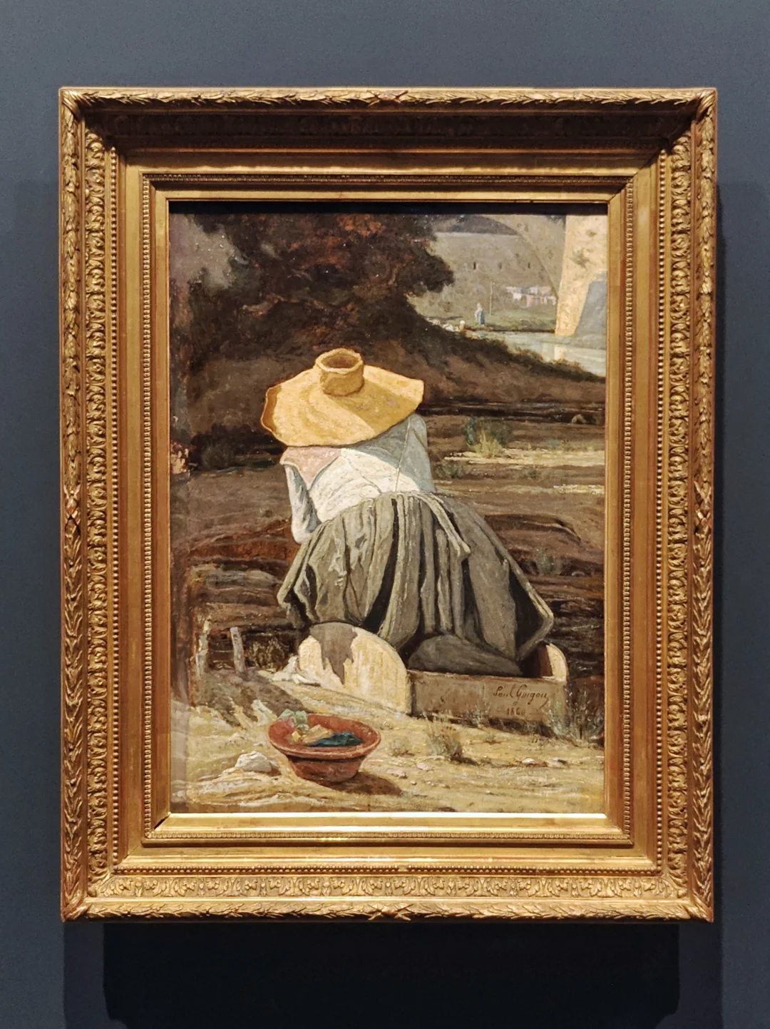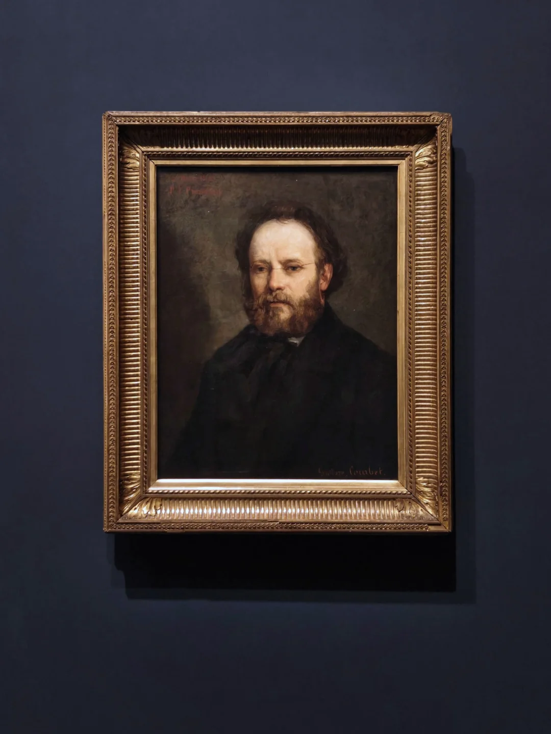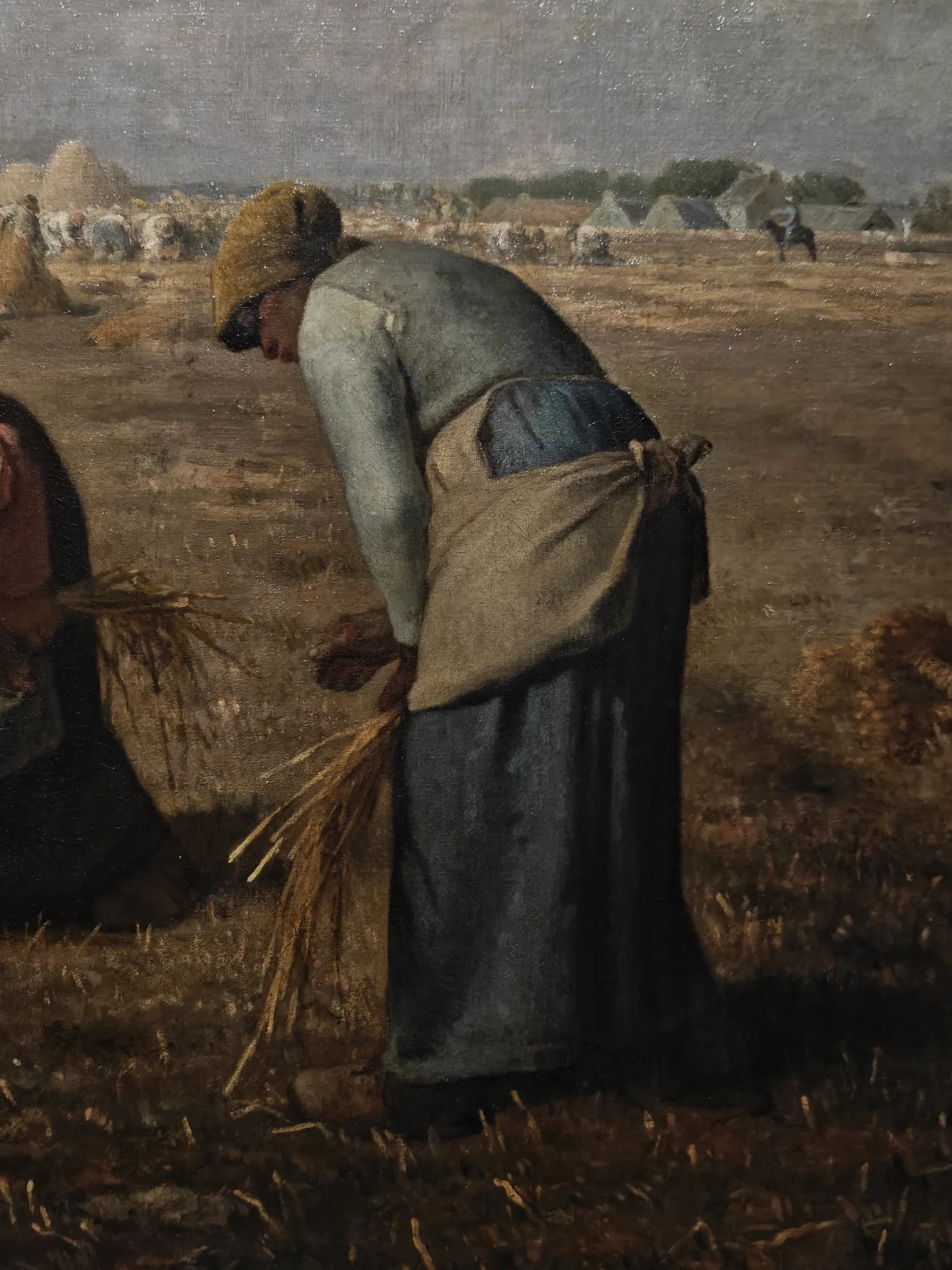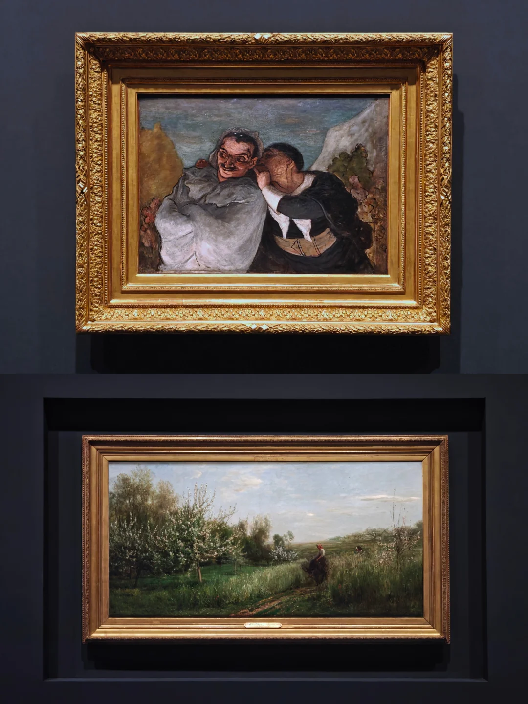本篇为第3篇,来到第二部分\u200c「现实主义到自然主义」\n\t\n浪漫主义之后出现了赞美大自然和描写普通人生活的现实主义艺术运动,用准确、真实的方式描绘事物,为印象派的到来拉开了序幕。\n\t\n🔍巴比松画派:以枫丹白露森林为基地的法国风景画家群体,受17世纪荷兰画派及英国画家康斯泰勃尔启发,以柯罗、米勒为核心,首创\"外光写生\"(en plein air)直面自然,破除学院派历史风景画程式。其光影实验与质朴乡野主题,直接启发了印象派革新,奠定现代风景画基石。\n\t\n🖼拾穗者\n👨\u200d🎨Jean-François Millet\u200c\n本次展览重点作品之一,十几年前曾经在中国艺术宫展出过。米勒代表作,现实主义里程碑式作品,以质朴的笔触展现了19世纪法国农民的生存状态。\n画面采用水平构图,三位农妇的红、黄、蓝头巾在暖黄色麦田背景下形成视觉焦点,其弯腰动作的重叠形成劳动韵律感。远景中堆积的麦垛与运粮马车,与前景拾穗者的贫瘠形成阶级隐喻。米勒通过粗粝的笔触和沉稳的赭石色调,赋予农妇雕塑般的厚重感,将平凡的劳动升华为庄严的史诗。\n米勒迁居巴比松村后,以农民生活为题材挑战当时艺术界对底层群体的漠视。该画在巴黎沙龙展出时引发争议,因真实揭露农业危机下的社会矛盾,成为批判现实主义的代表作。\n梵高是米勒的超级迷弟,一生临摹米勒作品超百幅,其中《播种者》仿作达30余幅,他认为米勒的作品\"重新唤醒了我”。\n⛓️展览中高更的《布列塔尼的农妇》和贝尔纳的《麦收》(图5),显露出与米勒的深度关联,将在后续笔记中介绍。\n\t\n🖼受伤的男人(自画像)\n👨\u200d🎨Jean Desire Gustave Courbet\n库尔贝是现实主义之父,以《采石工》《奥尔南的葬礼》等平民史诗对抗学院派的矫饰,“不画天使,只画可见的现实”。他在巴黎公社干了件大事,拆除由拿破仑建立、被革命者视作腐朽的旺多姆纪念柱,也因此被zz流放。\n这幅作品中,库尔贝以虚构的创伤颠覆自画像传统——颈间血迹与刺剑是精心设计的隐喻道具。X光检测发现它原是双人构图,一女子依偎其肩,原来他分手后将情人Virginie Binet的形象修改为了贯穿胸口的流血伤口——象征爱情之殇。而修改这一举动将情伤转化为\"英雄负伤\"的意象(从此画以及他许多的自画像也可知,是个帅B,也无怪乎他如此傲慢又自恋了)。\n\t\n⚠️字数限制,剩余见评论区\n