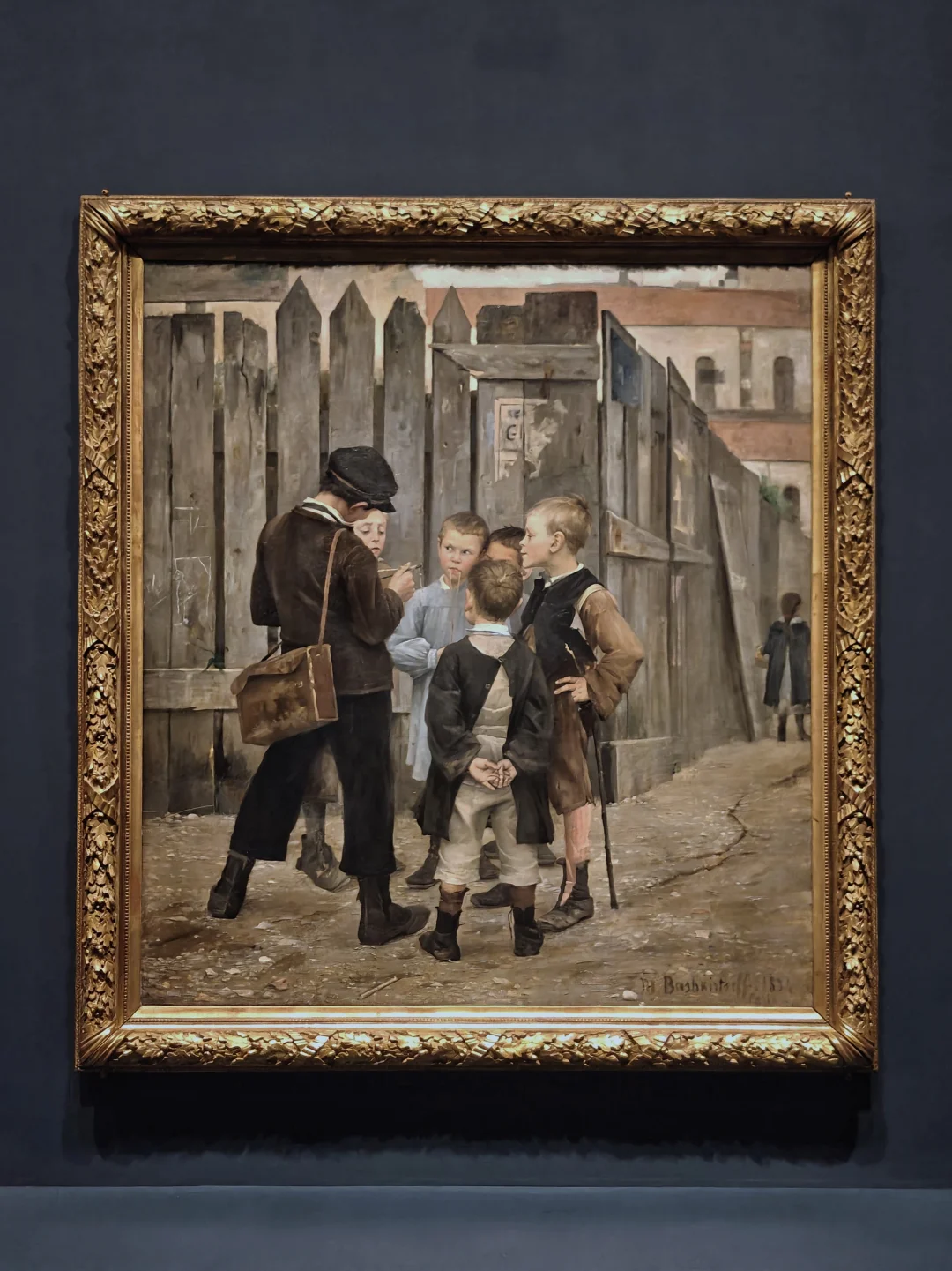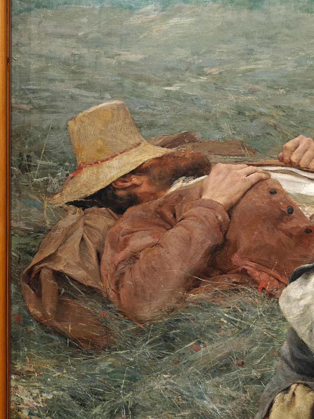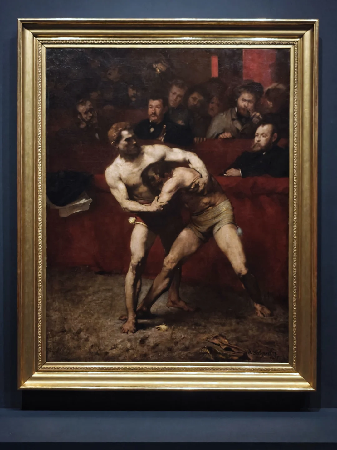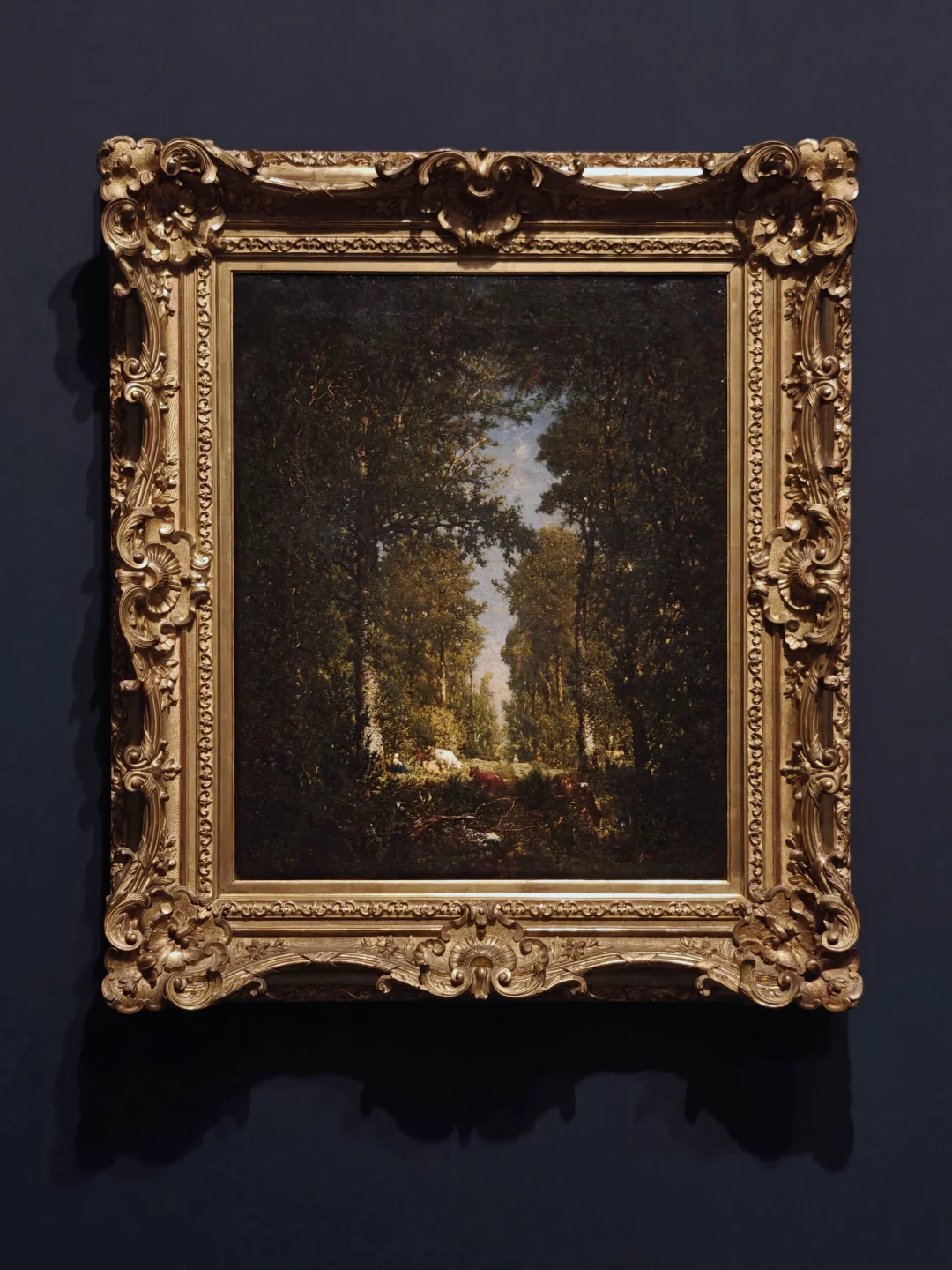 本篇为第3篇,来到第二部分\u200c「现实主义到自然主义」\n\t\n浪漫主义之后出现了赞美大自然和描写普通人生活的现实主义艺术运动,用准确、真实的方式描绘事物,为印象派的到来拉开了序幕。\n\t\n🔍巴比松画派:以枫丹白露森林为基地的法国风景画家群体,受17世纪荷兰画派及英国画家康斯泰勃尔启发,以柯罗、米勒为核心,首创\"外光写生\"(en plein air)直面自然,破除学院派历史风景画程式。其光影实验与质朴乡野主题,直接启发了印象派革新,奠定现代风景画基石。\n\t\n🖼拾穗者\n👨\u200d🎨Jean-François Millet\u200c\n本次展览重点作品之一,十几年前曾经在中国艺术宫展出过。米勒代表作,现实主义里程碑式作品,以质朴的笔触展现了19世纪法国农民的生存状态。\n画面采用水平构图,三位农妇的红、黄、蓝头巾在暖黄色麦田背景下形成视觉焦点,其弯腰动作的重叠形成劳动韵律感。远景中堆积的麦垛与运粮马车,与前景拾穗者的贫瘠形成阶级隐喻。米勒通过粗粝的笔触和沉稳的赭石色调,赋予农妇雕塑般的厚重感,将平凡的劳动升华为庄严的史诗。\n米勒迁居巴比松村后,以农民生活为题材挑战当时艺术界对底层群体的漠视。该画在巴黎沙龙展出时引发争议,因真实揭露农业危机下的社会矛盾,成为批判现实主义的代表作。\n梵高是米勒的超级迷弟,一生临摹米勒作品超百幅,其中《播种者》仿作达30余幅,他认为米勒的作品\"重新唤醒了我”。\n⛓️展览中高更的《布列塔尼的农妇》和贝尔纳的《麦收》(图5),显露出与米勒的深度关联,将在后续笔记中介绍。\n\t\n🖼受伤的男人(自画像)\n👨\u200d🎨Jean Desire Gustave Courbet\n库尔贝是现实主义之父,以《采石工》《奥尔南的葬礼》等平民史诗对抗学院派的矫饰,“不画天使,只画可见的现实”。他在巴黎公社干了件大事,拆除由拿破仑建立、被革命者视作腐朽的旺多姆纪念柱,也因此被zz流放。\n这幅作品中,库尔贝以虚构的创伤颠覆自画像传统——颈间血迹与刺剑是精心设计的隐喻道具。X光检测发现它原是双人构图,一女子依偎其肩,原来他分手后将情人Virginie Binet的形象修改为了贯穿胸口的流血伤口——象征爱情之殇。而修改这一举动将情伤转化为\"英雄负伤\"的意象(从此画以及他许多的自画像也可知,是个帅B,也无怪乎他如此傲慢又自恋了)。\n\t\n⚠️字数限制,剩余见评论区\n