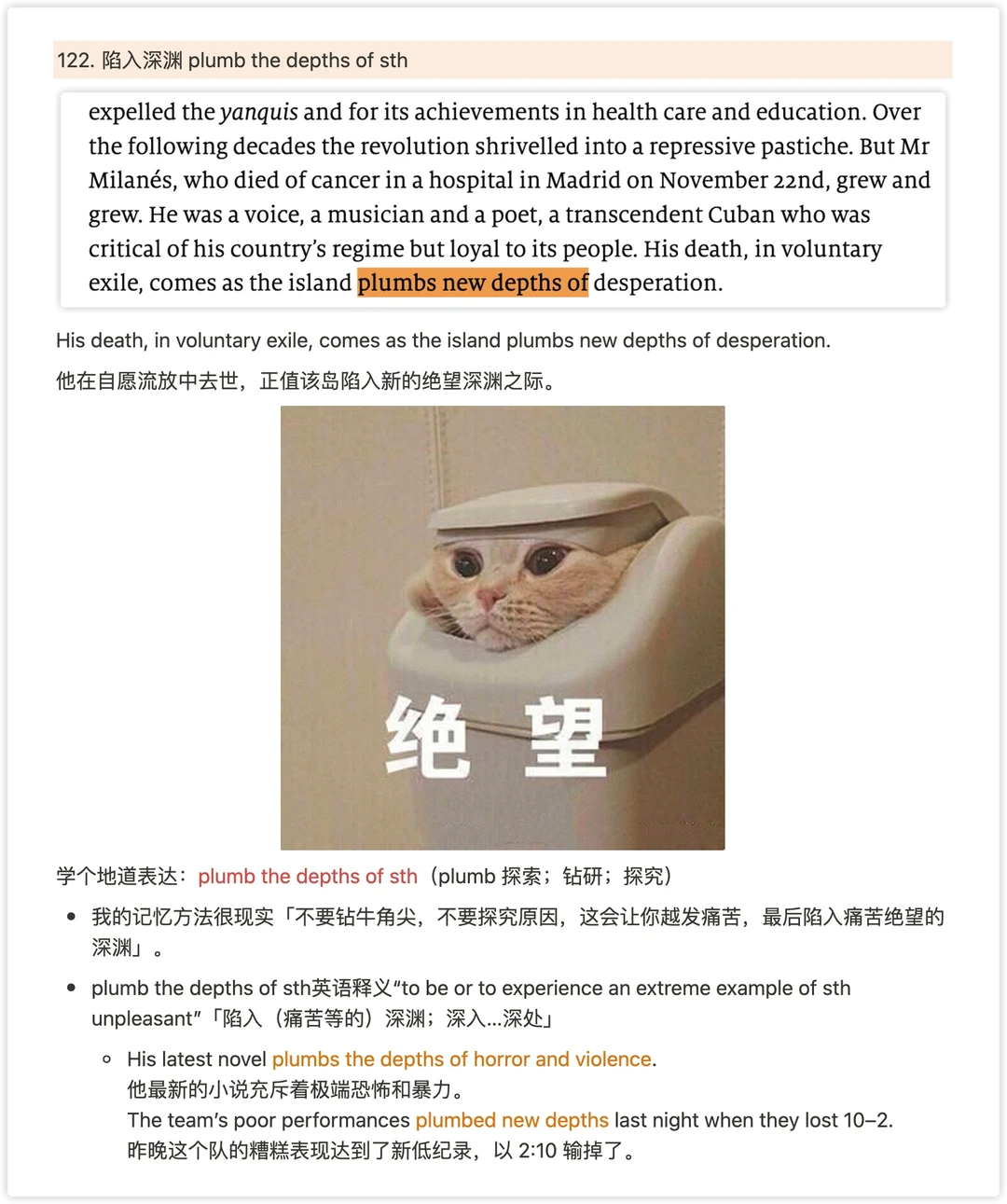1⃣️ 学个地道表达:plumb the depths of sth(plumb 探索;钻研;探究) 我的记忆方法很现实「不要钻牛角尖,不要探究原因,这会让你越发痛苦,最后陷入痛苦绝望的深渊」。