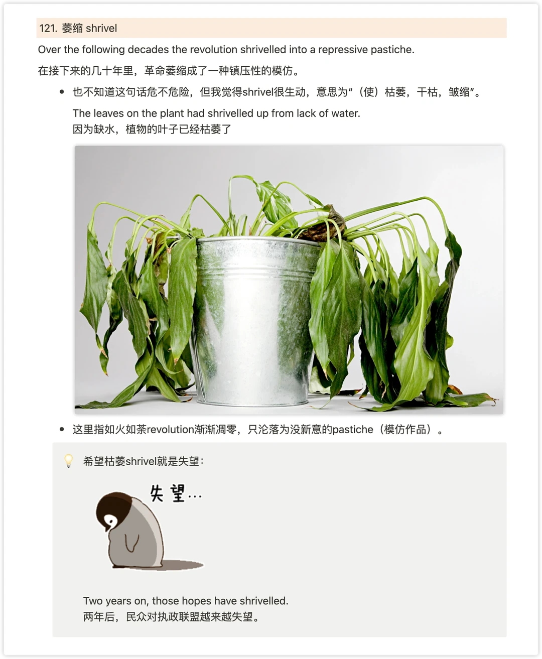 3⃣️ 我觉得shrivel很生动,意思为“(使)枯萎,干枯,皱缩”。这里指如火如荼revolution渐渐凋零,只沦落为没新意的pastiche(模仿作品)。
