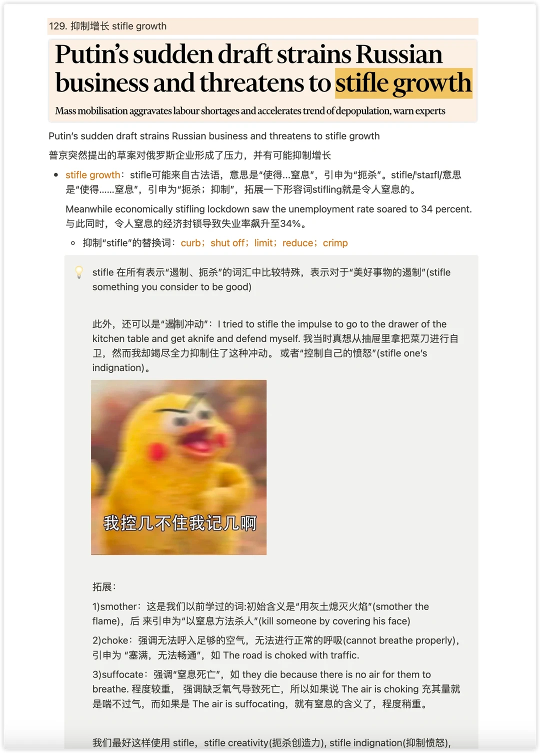 2⃣️ stifle 在所有表示“遏制、扼杀”的词汇中比较特殊,表示对于“美好事物的遏制”(stifle something you consider to be good)