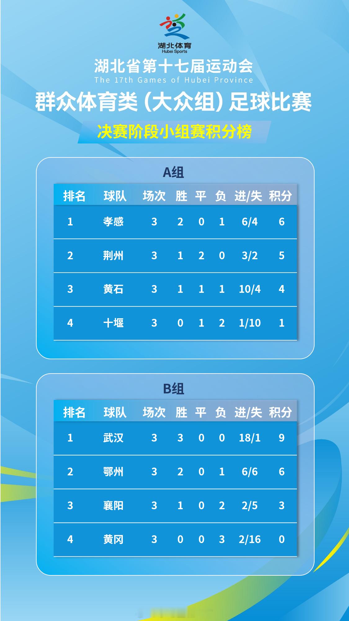 湖北省第十七届运动会群众体育类(大众组)足球比赛决赛阶段小组赛第3轮战报 武汉、孝感、鄂州、荆州晋级四强。武汉4:0襄阳【孙刚、祁天乐、谭斯、童晓星】黄石8:0 十堰【陈真(P)、祝诚呈x2、陈东x2、向炜俊、曹许杰、路亮】孝感1:2荆州【孙钰淇 / 张籽萌、龚道军】鄂州5:1黄冈【尹哲、刘仡、姜劲x2、闵佳明/刘伟【】湖北省第十七届运动会为湖北加油湖北足球湖北足球