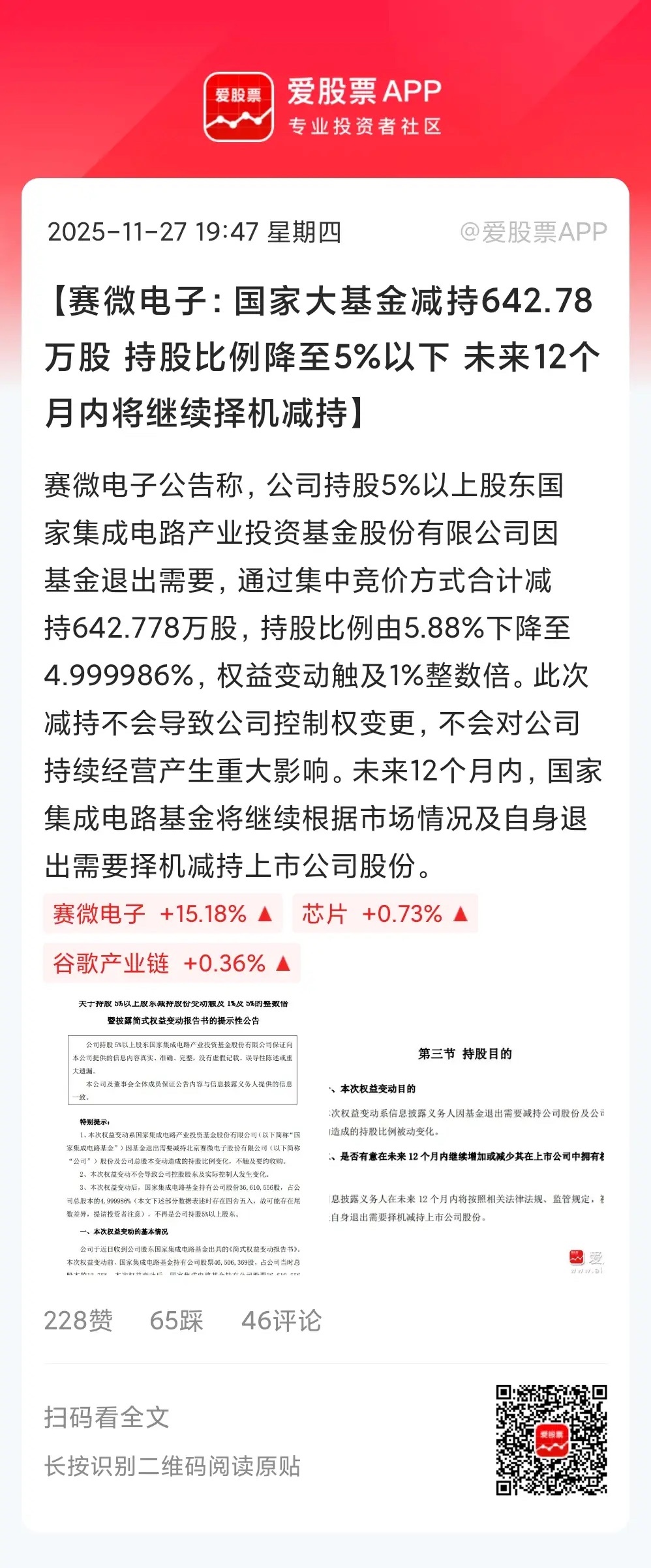 国家大基金挺会玩的,减持赛微电子642.778万股,套现小3个亿。更关键的是,减持后持股比例由5.88%下降至4.999986%,以后卖就不用公告了!赛微电子今年涨幅182%,是妥妥的大牛股!短短一个月从22块钱,到今天最高冲上50块了。资金这么热捧,国家大基金选择卖给大家,剩下近5%要全抛售的话,差不多能套现18亿元。A股科技股的问题,还是公司赚钱很难,但减持一点就是一大笔钱!这太考验人性了,股东肯定就想方设法减持了。