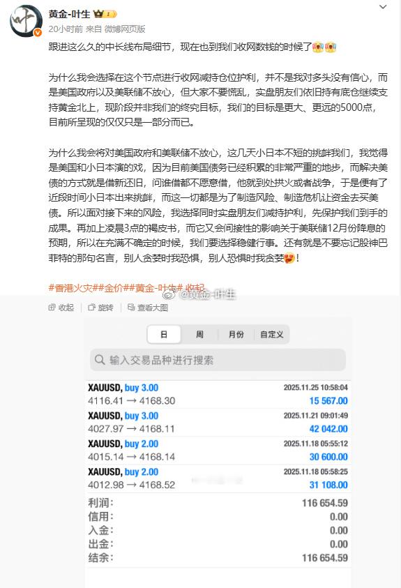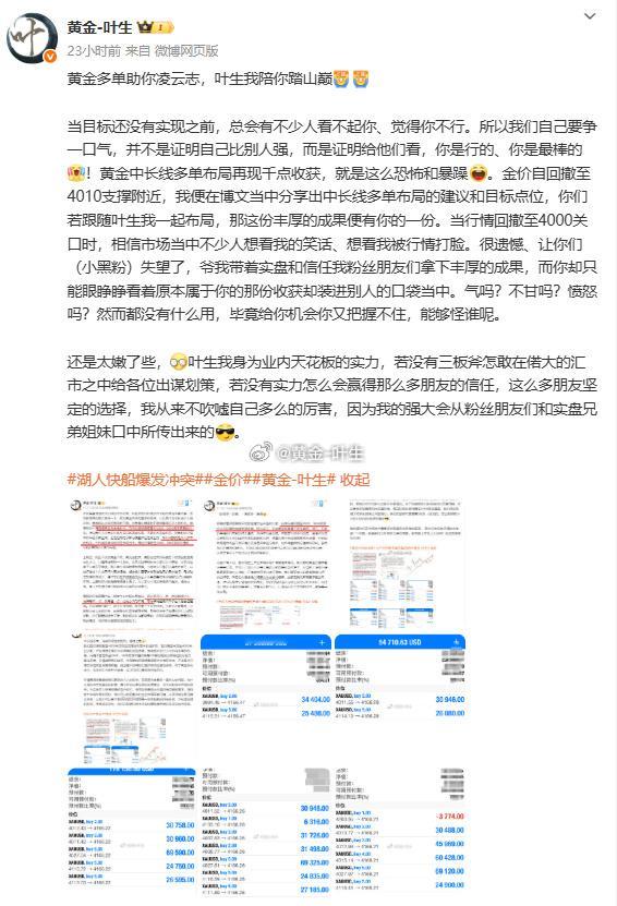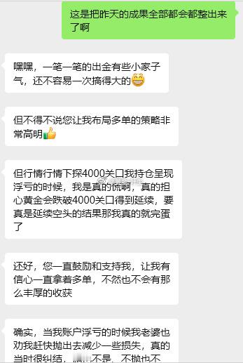 短线布局维持生活,中长线布局买房、买车我们在4010附近开始布局的中长线多单,昨天迎来阶段性收网的时刻,行情经过这几天的拉升成功给到我们4170一线,多单呈现1600点的成果,若你们简单跟上一手布局,那边可以轻松拿下1.6w🔪的成果,就是这么简单、粗暴,这也是为什么淘金者都钟爱中长线的布局。但你们不能光看吃肉,每天我都会分享几次关于中长线的布局,期间也有因为数据行情挨打,当然挨打也是打的最重的,毕竟动不动200-300点的亏损不是什么家庭都能够承受的。这也是为什么我会把参与中长线门槛调到10w🔪的原因,正所谓有多大的锅,我们就下多少米,在高风险高收益的市场当中,傲高物远是最不该出现的心态,我们要学会务实,学会留得青山在不愁没柴烧的道理,以时间来换空间积累资本才是王道,而不是总想着一夜暴富、一单吃到饱这样的发生在你身上,你们要知道参与中长线布局的投资者经历什么困难和艰辛才能够拿下现如今的成果,这是为不拦着他们出金去靠慰这段时间辛苦的自己。香港向每户灾民发1万港元补助金价黄金-叶生