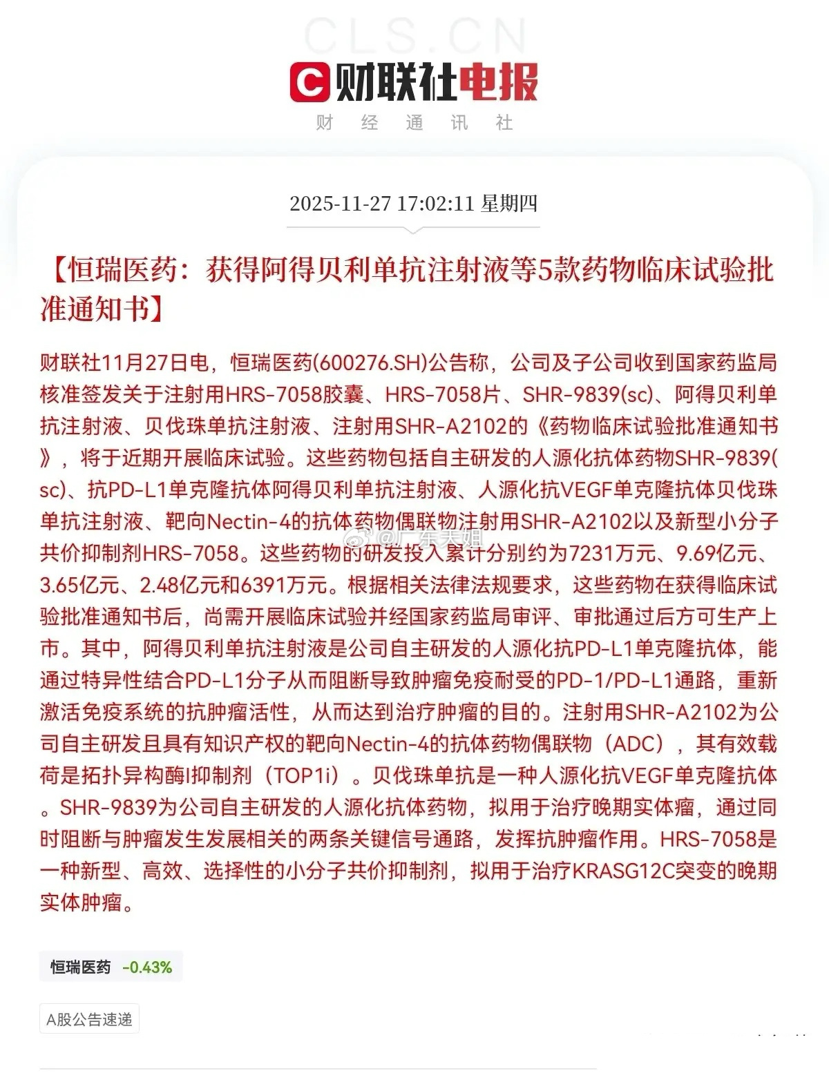 恒瑞医药明日要起飞了!就在刚刚,恒瑞医药传来重大利好消息!不出意外的话,明日恒瑞医药要跳空高走了,40万中小股东要兴奋的睡不着了……下午5点02分,恒瑞医药发布重要公告,公司及子公司获得阿得贝利单抗注射液等5款药物临床试验批准通知书,这个消息对于恒瑞医药来说是重大利好,5款新药获得临床试验批准通知书标志着其在创新药物研发领域取得了重要进展,有助于公司拓展新的产品线,提升公司市场的竞争力和国际影响力,同时这也预示着恒瑞医药的这5款新药离上市的日子越来越近了,新产品一经大量上市势必会对公司的业绩贡献将显著提升,未来这些新药有望成为公司未来收入增长的新突破点,值得期待!股民们,保持耐心,受新药利好消息刺激,明日恒瑞医药有望大爆发了,甚至创新药板块也有望火力全开!