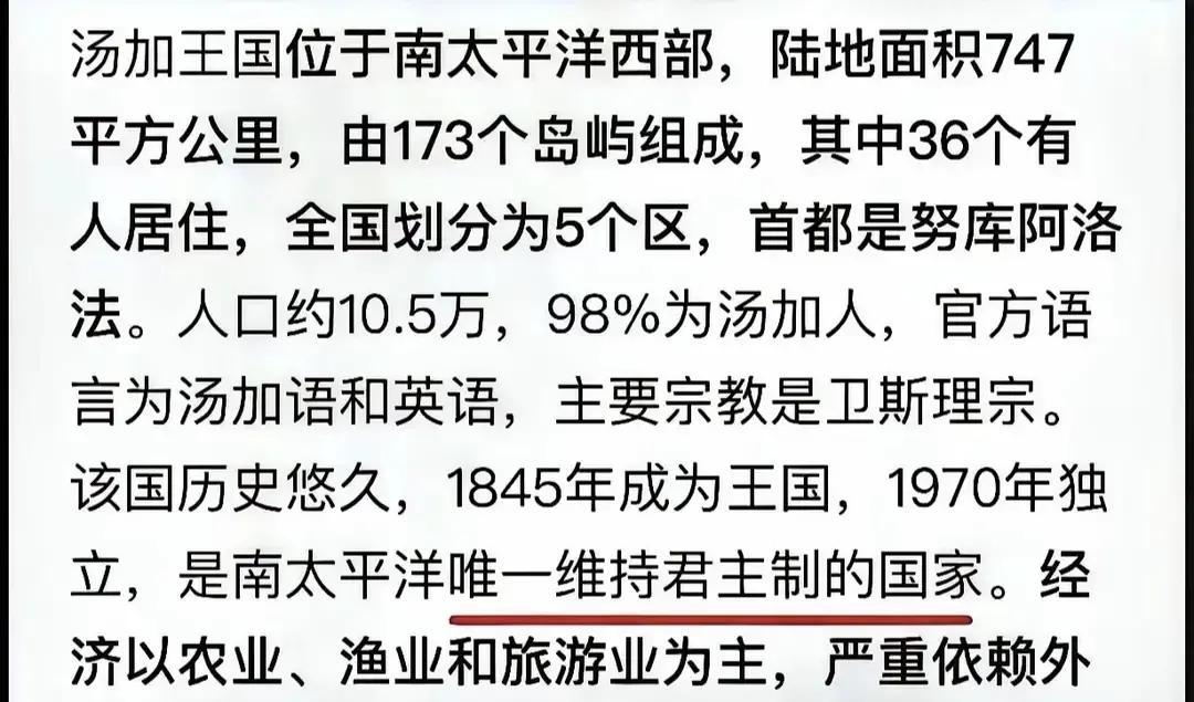 汤加国王访华,引起网友热议!有说是来化缘的,有说是来要钱的,还有说是蹭关系要援助。说什么的都有! 先给大家补个关键背景:2022年汤加海底火山大爆发,整个国家几乎被火山灰埋了——庄稼全毁,海水被污染,连饮用水都成问题,旅游业直接停摆。当时中国是第一个把援助物资送过去的国家之一,不仅有帐篷、食品,还有现金支持,汤加总理当时对着镜头说“中国是我们最可靠的朋友”,这话可不是随便说的。 这次国王来,真不是单纯“要援助”。我查了下行程,除了谈灾后重建的后续支持,还签了渔业合作备忘录。汤加周围的南太平洋海域,金枪鱼资源是出了名的好,但之前他们没冷链和运输渠道,根本卖不到中国。现在合作了,咱们老百姓能吃到新鲜的深海金枪鱼,汤加能靠出口赚外汇,这不比单方面给钱靠谱? 网友说的“化缘”其实有点片面。汤加确实经济依赖外援,但这次更多是找合作机会。而且汤加在国际上一直站咱们这边——比如联合国人权理事会投票,汤加多次支持中国反对西方干涉内政的提案;去年佩洛西窜台,汤加第一时间表态“坚持一个中国原则”。这些立场,可不是用钱能买的。 咱们帮朋友,从来不是当冤大头。要看对方是不是真心。汤加1998年就断了和台湾的关系,25年里没动摇过一个中国原则,这种朋友,帮一把怎么了?总比那些拿了几十亿援助还反咬一口的白眼狼强吧? 国际上的事,不能只看表面。汤加虽然国土小、人口少,但也是联合国成员国,在气候变化、海洋权益这些议题上,咱们和汤加的立场一致。多一个这样的朋友,在国际舞台上就多一份声音。 最后说句实在的:朋友之间,互相帮忙是应该的,但前提是“双向奔赴”。汤加这次来,既是寻求支持,也是带着合作诚意的。只要他们懂得感恩,咱们就继续做朋友——毕竟,多个真心朋友,总比多一个敌人强太多了。你们觉得呢? (字数约800)