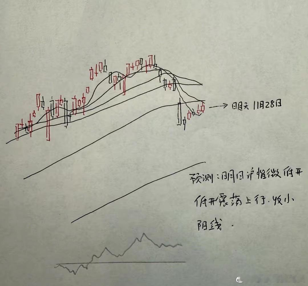 A股连续三天午后跳水必有妖,那么明天A股怎么走呢?莎莎做了一个大胆的预判,大家来听莎莎讲三个具体理由第一,大家最担心的是,创业板指今天早盘大涨超过2.2%但是最终收盘居然还下跌了0.44%。如此大幅度的回撤,是不是调整要开始了?其实就我观察而言,创业板指数最近被几只硬科技里面的大权重的个股带偏的是比较严重的。这几只权重个股对于创业板指数形成了非常大的影响。但是如果我们从上证50,中证2000,中证1000,中证500等细分指数来看,这些指数目前还没有明确的见顶信号。甚至这两天表现出的是强势震荡状态。大家请看图一中证2000k线图。从中证2000k线图,我们可以发现中这两千指数在本周一、二两天连续大涨之后,星期三、星期四都是属于高位强势震荡。并没有出现深度回踩的动作。第二,从图二上证指数的角度来分析,上证指数在本周星期一开始反弹以来,并没有上涨多少。上涨的幅度非常的有限。今天的冲高回落上影线,属于相对低位的长上影线。而这种低位长上影线个人认为,具备向上“仙人指路”的k线特征。也就是说,今天的上影线在明天是有很大概率被修复的。第三,从创业板指的角度来分析,创业板今天虽然大幅冲高之后,最终收了阴线。但是从60分钟级别来看,创业板指数,目前依然有可能处在1浪完成之后的浪2 abc结构调整当中。大家请看图三,创业板指日线图。一旦完成了abc结构的调整,创业板指明天依然是有可能展开新一轮上升波段的。所以,综合以上分析,对于市场走势的判断,莎莎认为不必过度悲观。明天上证指数依然有望走出小实体的阳线。那么明天A股到底怎么走?大家请看图四关于明天走势莎莎手绘的预测图当然关于市场走势的分析,莎莎多半从纯粹的技术面出发,对于消息面和基本面的分析则相对较少。所以我的观点不一定正确,仅代表个人见解,不代表任何投资建议。最后莎莎还想给大家补充一点的是,本轮指数从低点反弹以来,目前,已经走出了重心连续小幅上移的走势。这种重心连续缓慢抬升的走势,最终是有可能引发短线的加速的。而在此之前,市场的走势会让大家感觉缺少确定性,缺少持续性。但是我认为正是印证了那一句话,行情在犹犹豫豫当中发生。我们不妨给市场多一点耐心,也许明天市场就会走出短线的确认性了。兄弟们点赞,评论,加关注就是对莎莎这个纯技术派的最大支持。