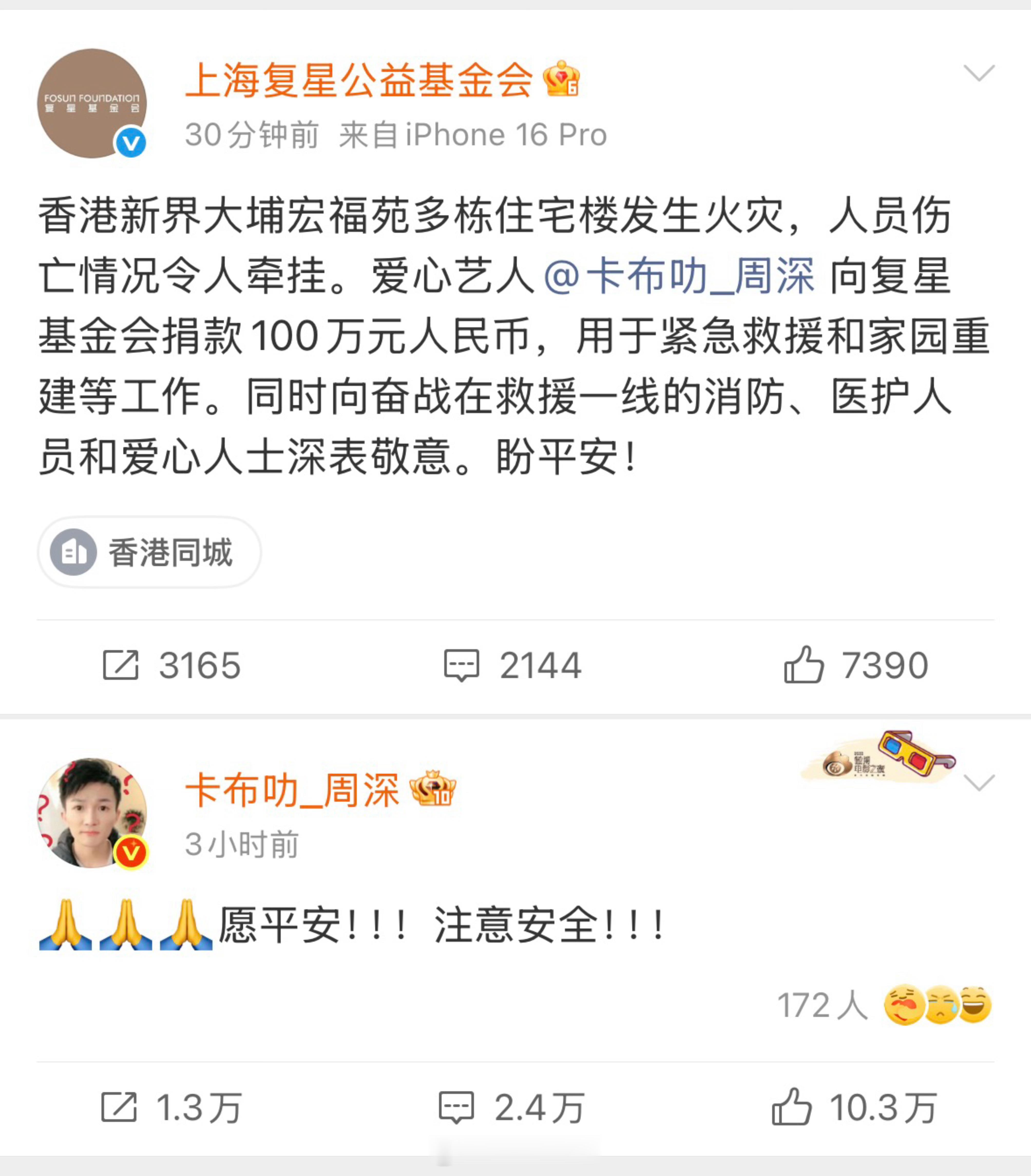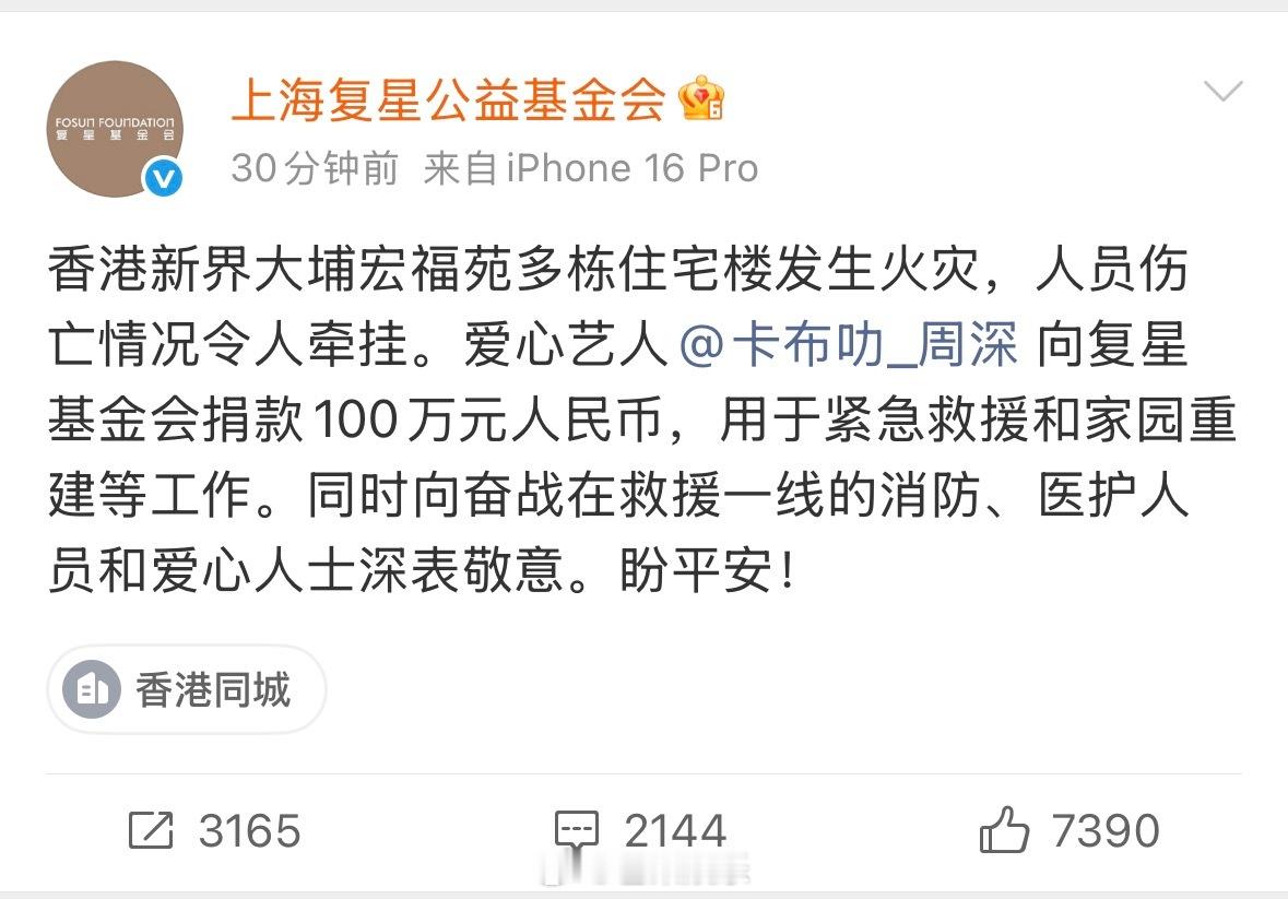 周深捐款100万 多名艺人为香港捐款 周深为香港火灾捐款100万元,一直都在默默做公益的深深!风雨同舟,守望相助,香港加油
