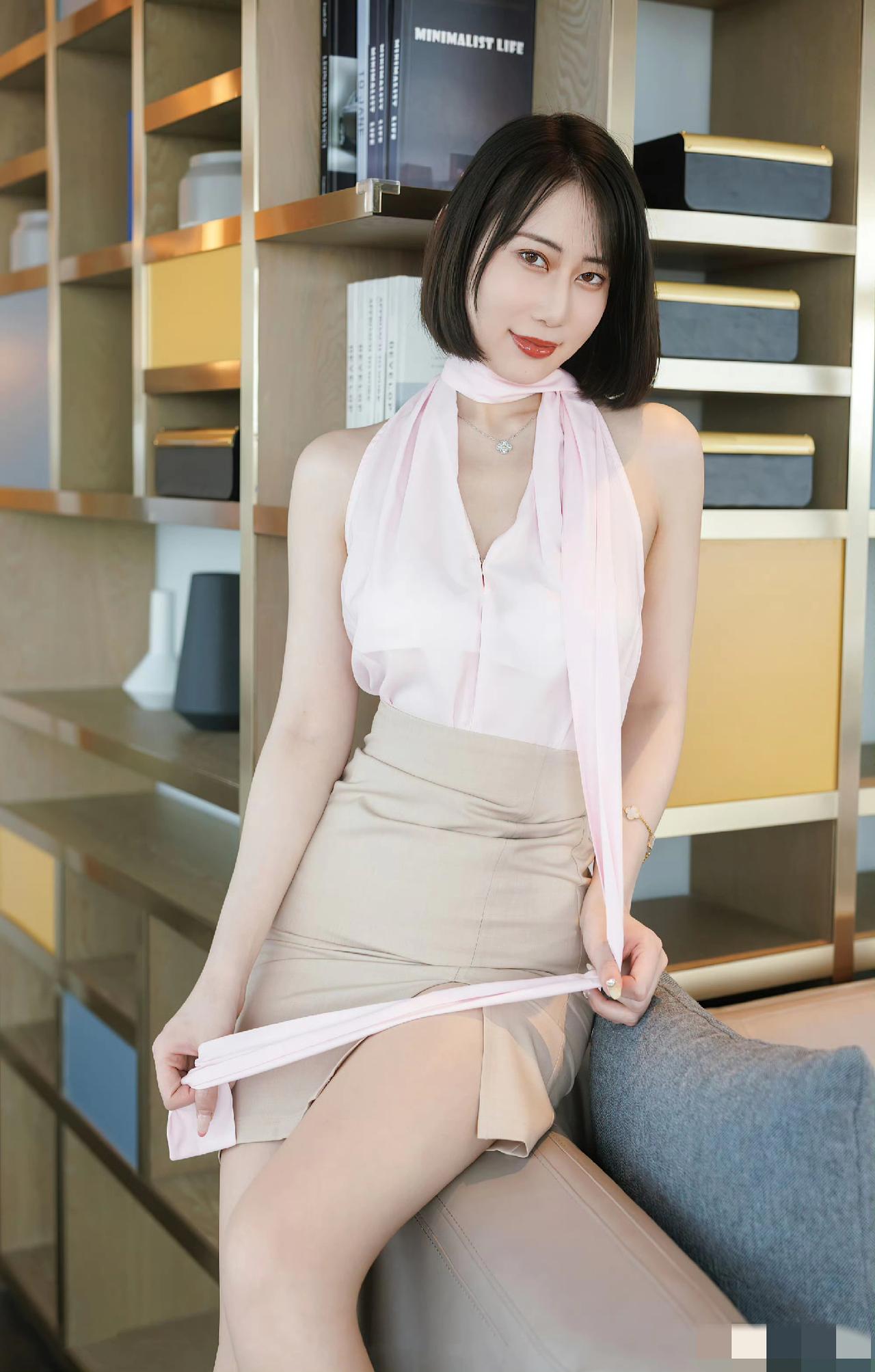 优雅职场风,粉色丝巾搭配米色连衣裙,高跟鞋点缀,尽显女性魅力!