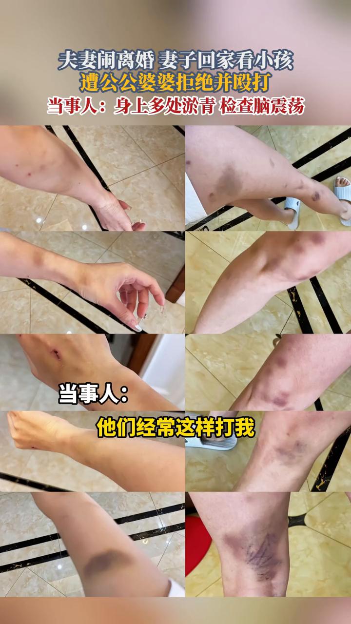 夫妻闹离婚妻子回家看小孩遭公公婆婆拒绝并殴打。当事人:身上多处淤青,检查脑震荡。 8月20日,江苏泰州。公公将母女推出门,女子发视频称因回家看孩子想带孩子走遭到公婆连环殴打,找丈夫谈离婚,丈夫躲在屋里避而不见。 女子胳膊摔坐在地上,用力拧。当事人:昨天晚上我去看我女儿,干什么呢!他儿子一直躲着,期间一直大骂女子,扇巴掌。闹离婚都不出面,他们经常这样打我。昨天晚上查的是脑震荡,身上都是淤青,淤血。