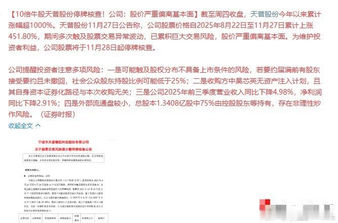 10倍大牛股天普股份停牌!昨天品茗科技预停牌,直接大跌12CM!天普股份昨天第二波3连板涨停被砸,晚上停牌核查。最近停牌,预停牌,不仅针对高标连板,现在高标趋势也纳入强JG兑现。品茗科技,天普股份都是趋势二波大涨。值得注意的是之前停牌,预停牌都针对的是涨停股,当日涨停股,现在当日下跌,上涨,次日都可能停牌。品茗科技昨天的预停牌,对高标连板,涨停股打击巨大,昨天连板指数全A跌幅榜第一,高标股,涨停股亏钱效应,空间板压缩至4板。今天10倍股天普股份停牌,雪上加霜,另一个20倍股上纬新材也要小心点。