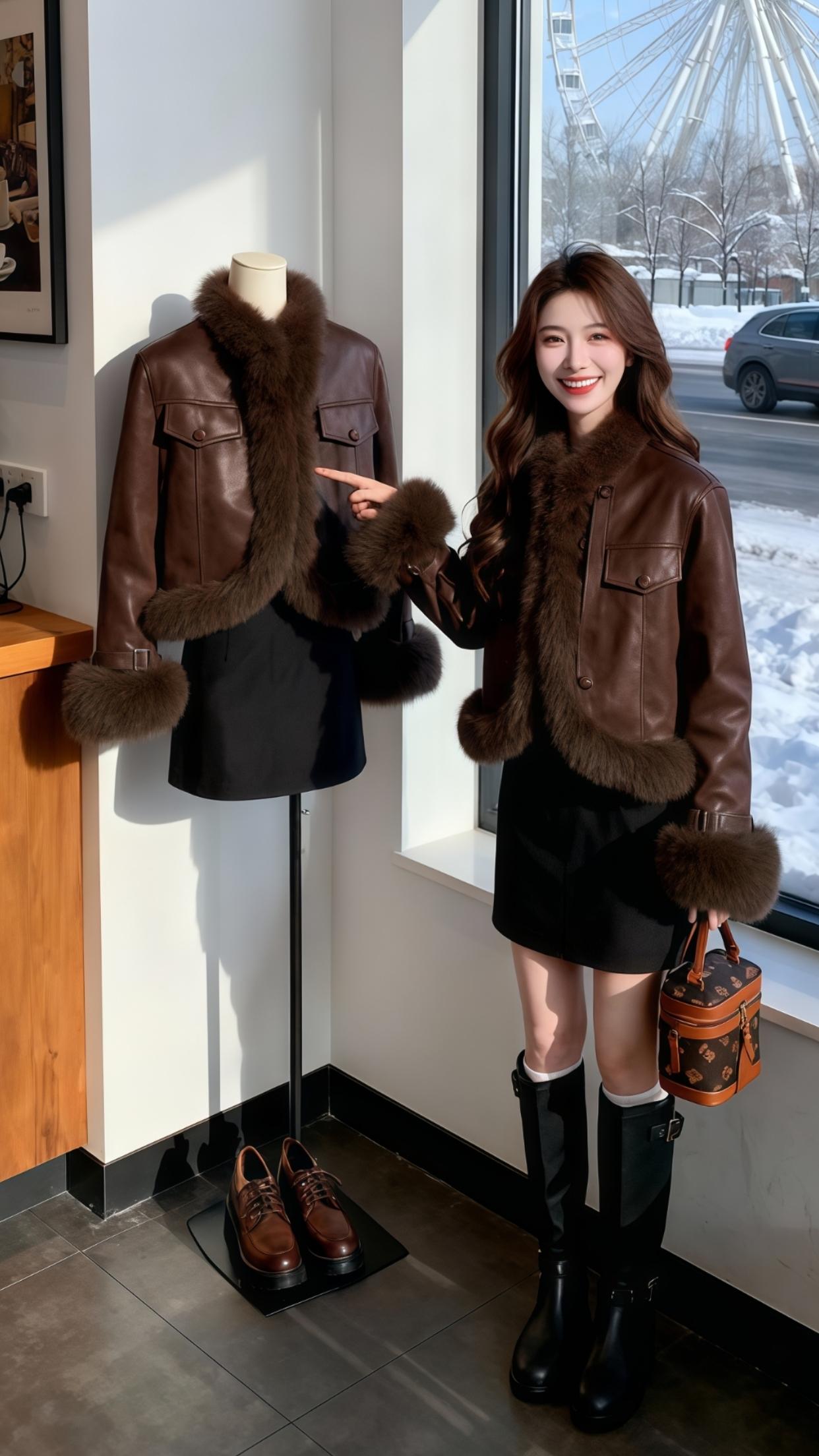 这套穿搭是「性感轻熟风」的代表~黑色皮质连衣裙自带酷飒质感,收腰包臀的中长版型勾