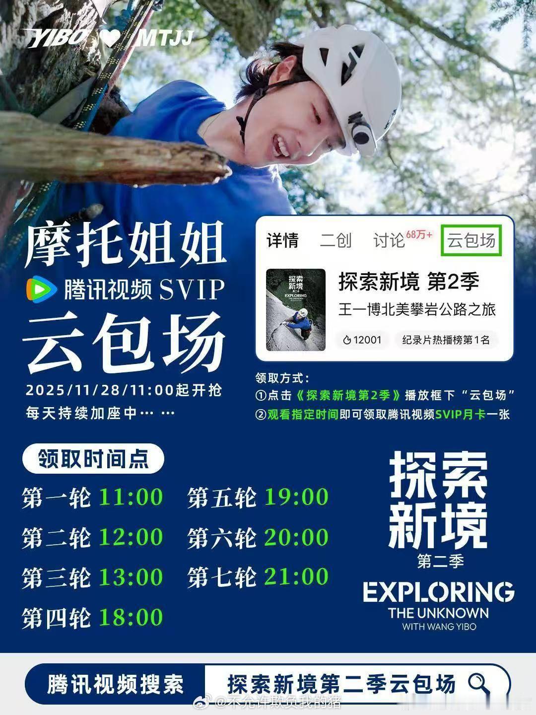 王一博探索新境2今天中午11点腾讯视频开播,是腾讯视频首个预约破100万的纪录片。王一博粉丝和品牌方送了近4万场云包场,还在加场中,送的是svip会员哦,真的好大方。欢迎中午来看