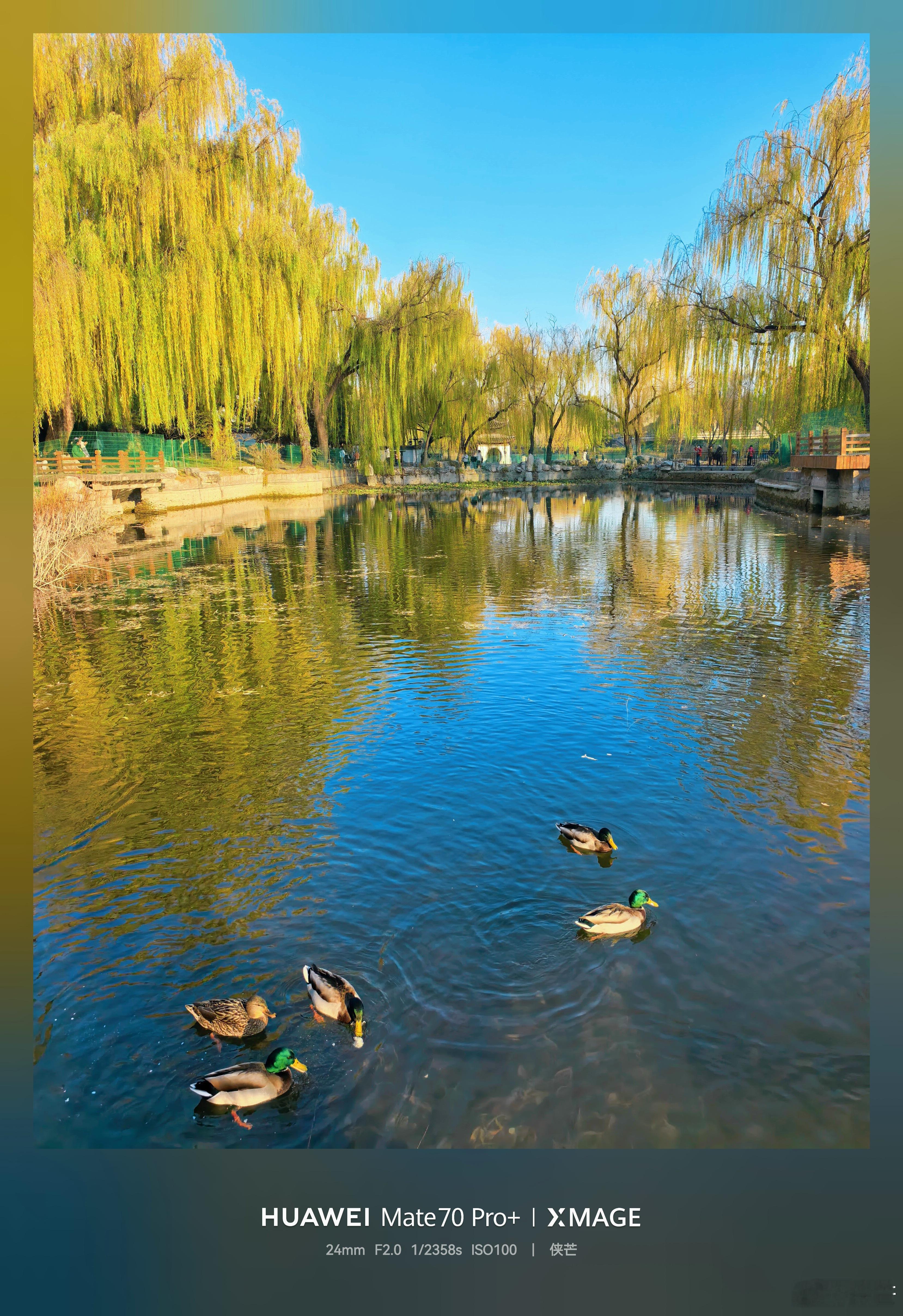 小雪晴光——陶然亭初冬私语 小雪时节,暖阳轻洒,陶然亭公园内杨柳染金,枝条在微风中婆娑起舞,金黄的叶影随光闪烁,仿佛将最后的秋意揉进了冬日的怀抱。 游人三三两两,或倚栏静坐于亭阁之中,闭目沐光,任暖意沁入心脾;或手持相机,捕捉这难得的清朗景致,将笑语与身影一同定格在初冬的画框里。湖面未冻,碧波轻漾,一群绿头鸭悠然嬉戏,时而拨水展翅,时而追逐游弋,划出圈圈涟漪,为静谧的园景注入勃勃生机。 此时此景,不似严冬将至,倒像是季节悄悄回眸,赠予人间一场温柔的停驻。在这小雪无雪的日子里,陶然亭以它独有的闲适与诗意,诉说着冬日里最动人的暖意与生机。北京你好 摄影
