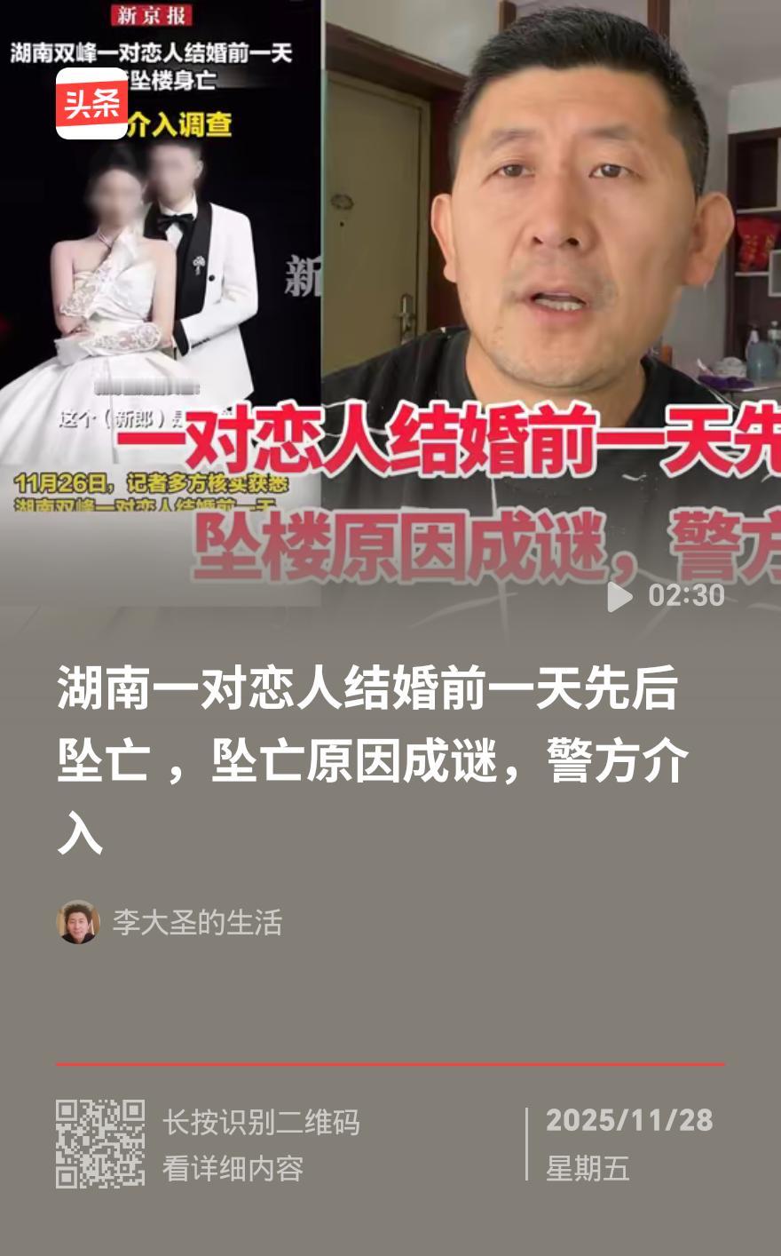 炸锅!湖南25岁情侣婚前一天双坠亡 44分钟空白+4秒通话藏猫腻 湖南这起悲剧太揪心!25岁的小两口恋爱六年马上办婚礼,婚前一天竟先后从女方家坠楼,两条年轻性命说没就没,背后疑点多到让人脊背发凉。 新郎曾中阳和新娘阳芳都是实干派,一起开了三家早餐店,家底厚实得很,房子车子全款无贷,双方父母都满意,婚礼定在11月25号。11月23号晚上请朋友吃喜酒预热,闹到24号凌晨2点散场。监控拍得明明白白,曾中阳下车时步子稳当,还叮嘱接亲细节,脑子清醒得很,压根没喝多,之后两人回了女方家。 凌晨时分曾中阳坠楼当场身亡,早上7点40分阳芳被母亲叫醒,看到男友遗体瞬间崩溃,冲上四楼跳下,下午抢救无效离世。警方初步说曾中阳喝多走错门坠楼,这说法直接被家属怼回。 曾中阳家人拿出证据,凌晨5点04分他给阳芳打了两个微信视频,第一个没接,第二个接通4秒就挂了。喝迷糊的人能准时发视频?他平时喝酒从不过量,当天也没拼酒。更可疑的是,女方父亲第一个发现坠亡,却拖到7点10分才报警,中间44分钟到底发生了啥。 阳芳和曾中阳睡一个房间,为啥老公坠楼一个多小时才被叫醒。女方父亲在村里名声极差,是出了名的赌鬼还家暴,不少村民都能作证。有人猜他是不是欠赌债向曾中阳要钱没成起冲突,但彩礼问题已被双方家属辟谣。 目前双峰县公安局已介入,女方父亲被问话,手机和现场痕迹都被提取,警方回应暂非刑事案件。曾中阳83岁的奶奶还被蒙在鼓里,双方父母哭到崩溃。好好的婚礼变葬礼,44分钟空白和4秒通话到底藏着啥真相。 你觉得这事儿是意外还是另有隐情 婚前该咋摸清对方家庭情况跳楼事故 新婚跳楼