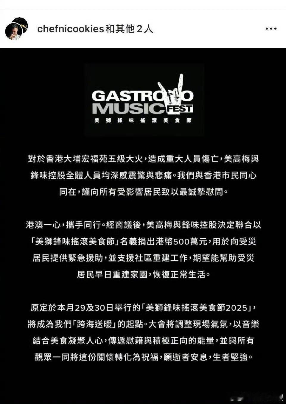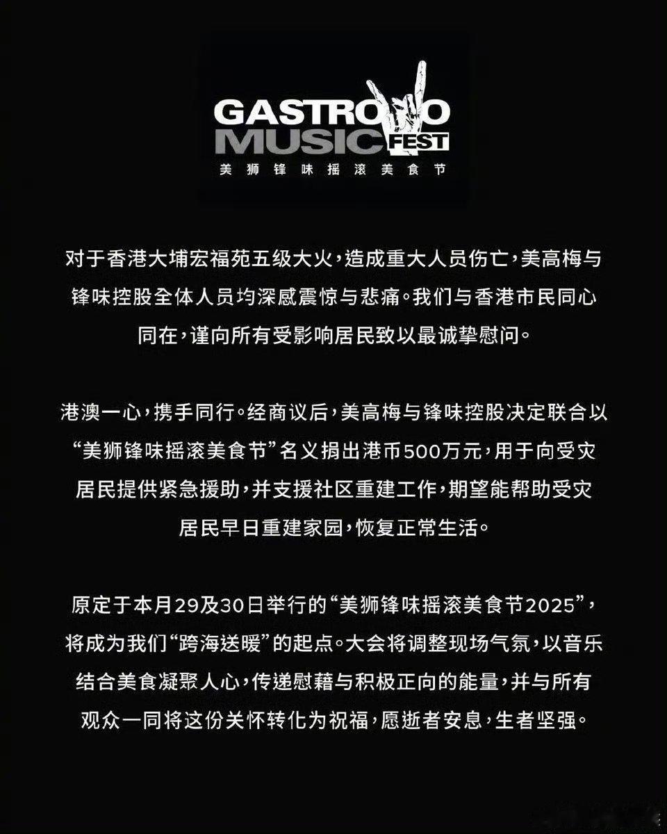 谢霆锋何超琼为香港火灾捐款500万 守望相助抗灾情!谢霆锋通过锋味控股、何超琼依托美高梅共捐500万港币,助力香港大埔火灾紧急救援和社区重建,与社会各界同心,盼港城早日恢复安宁~
