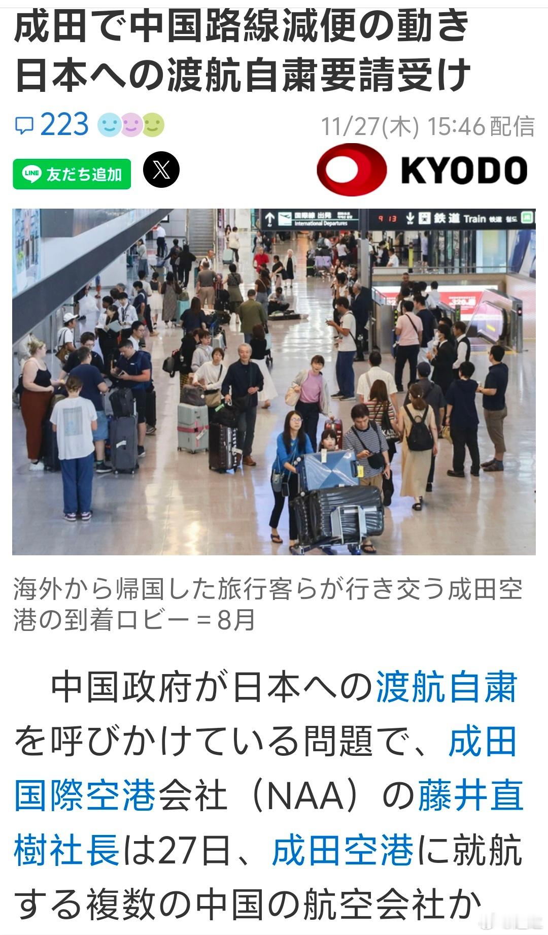 高市早苗严重越线挑衅一意孤行东京成田机场icon一周就少了300架次航班。中国飞机不来日本了。据共同社援引日本最大的国际航空港成田机场icon的数字,在过去一周,由于中国各航空公司减少了班次,成田机场少了大约300架次航班。藤井在例行记者会上表示:“在整个成田机场的通航中,中国航线占了很大比例。目前还没有掌握具体的影响。”据NAA统计,10月份的国际航线起降次数中,中国航线为2480次,约占总数的17%。
