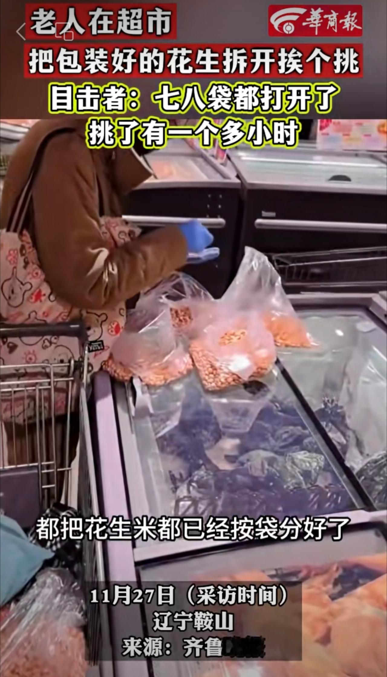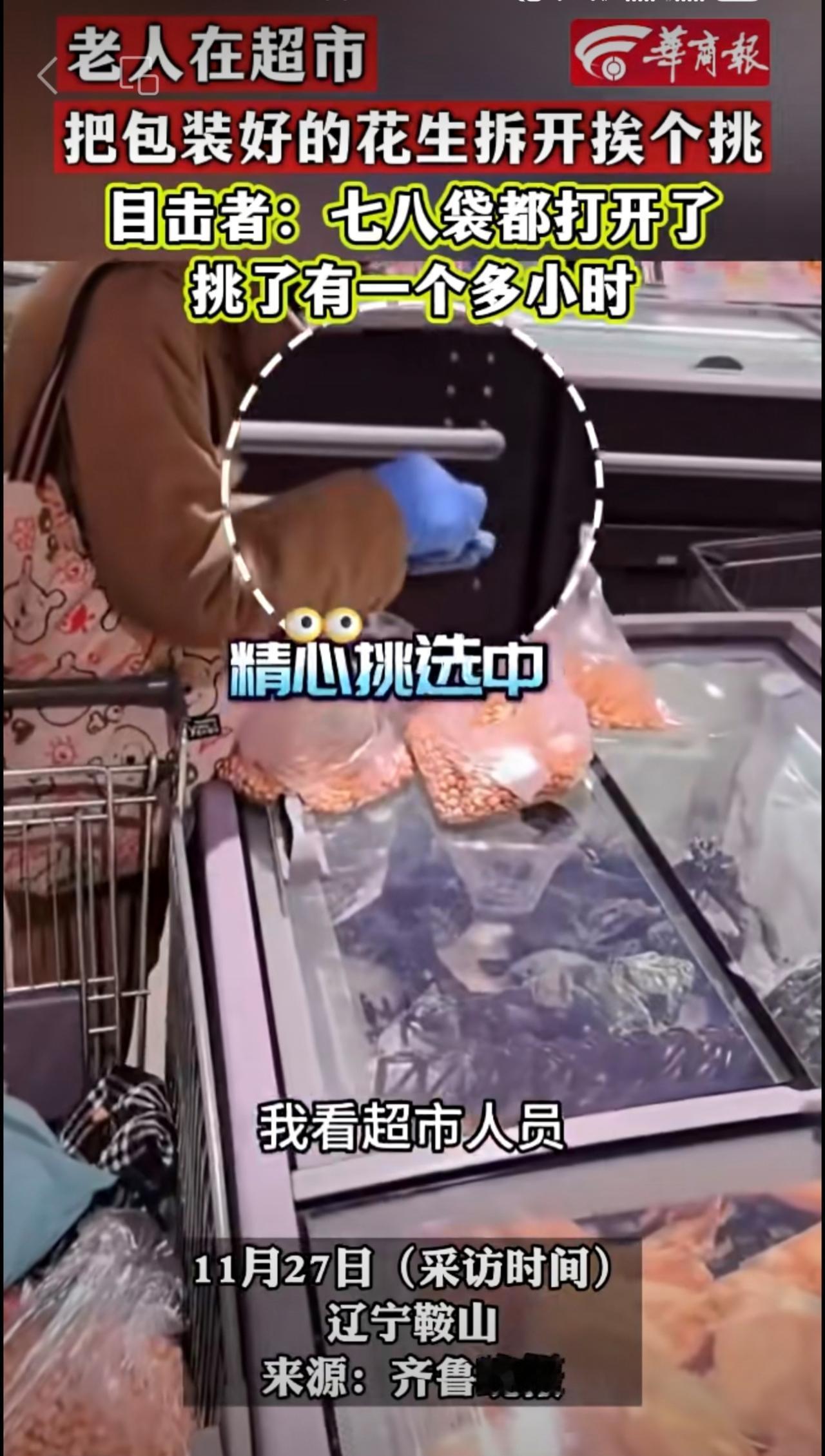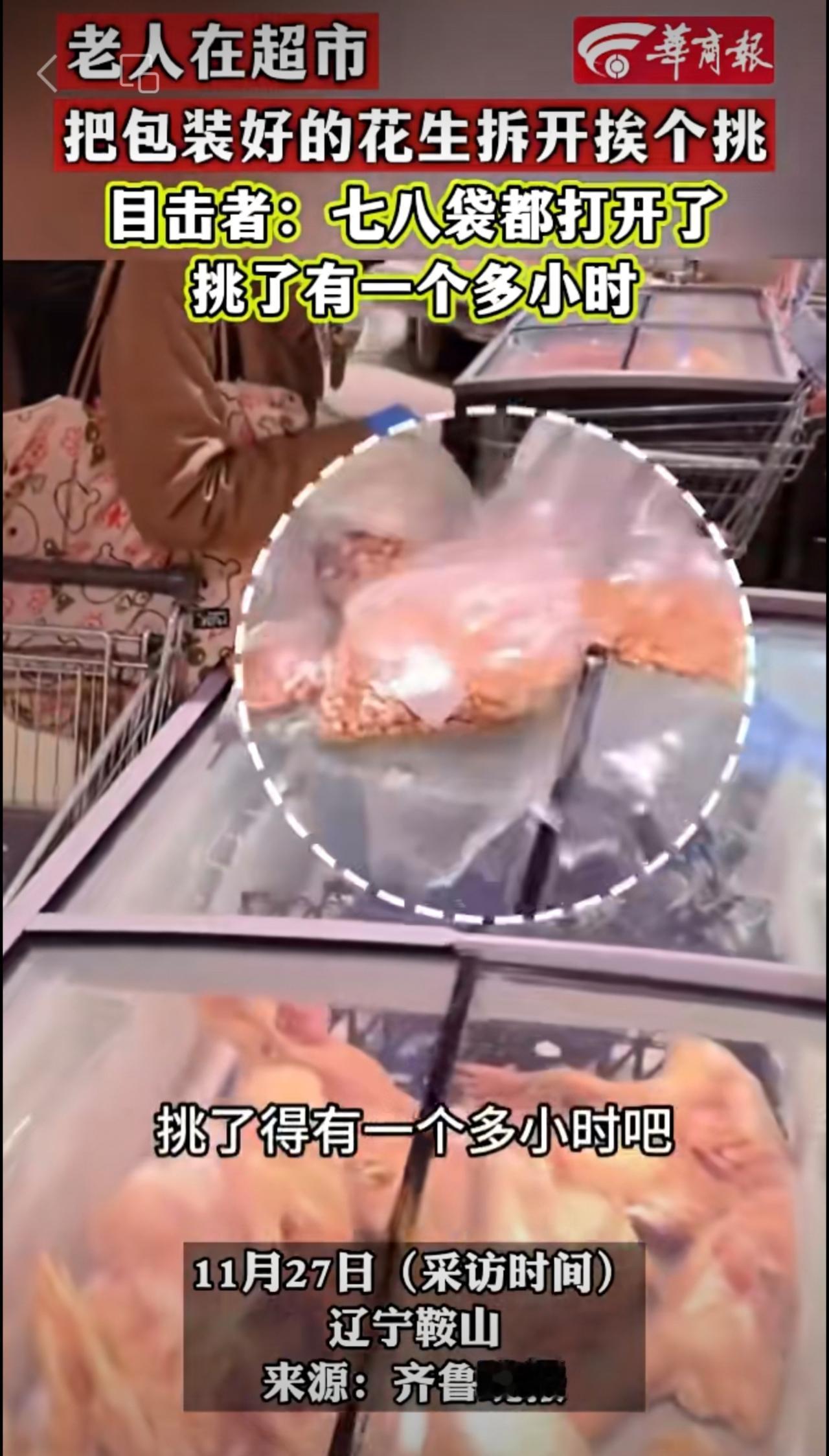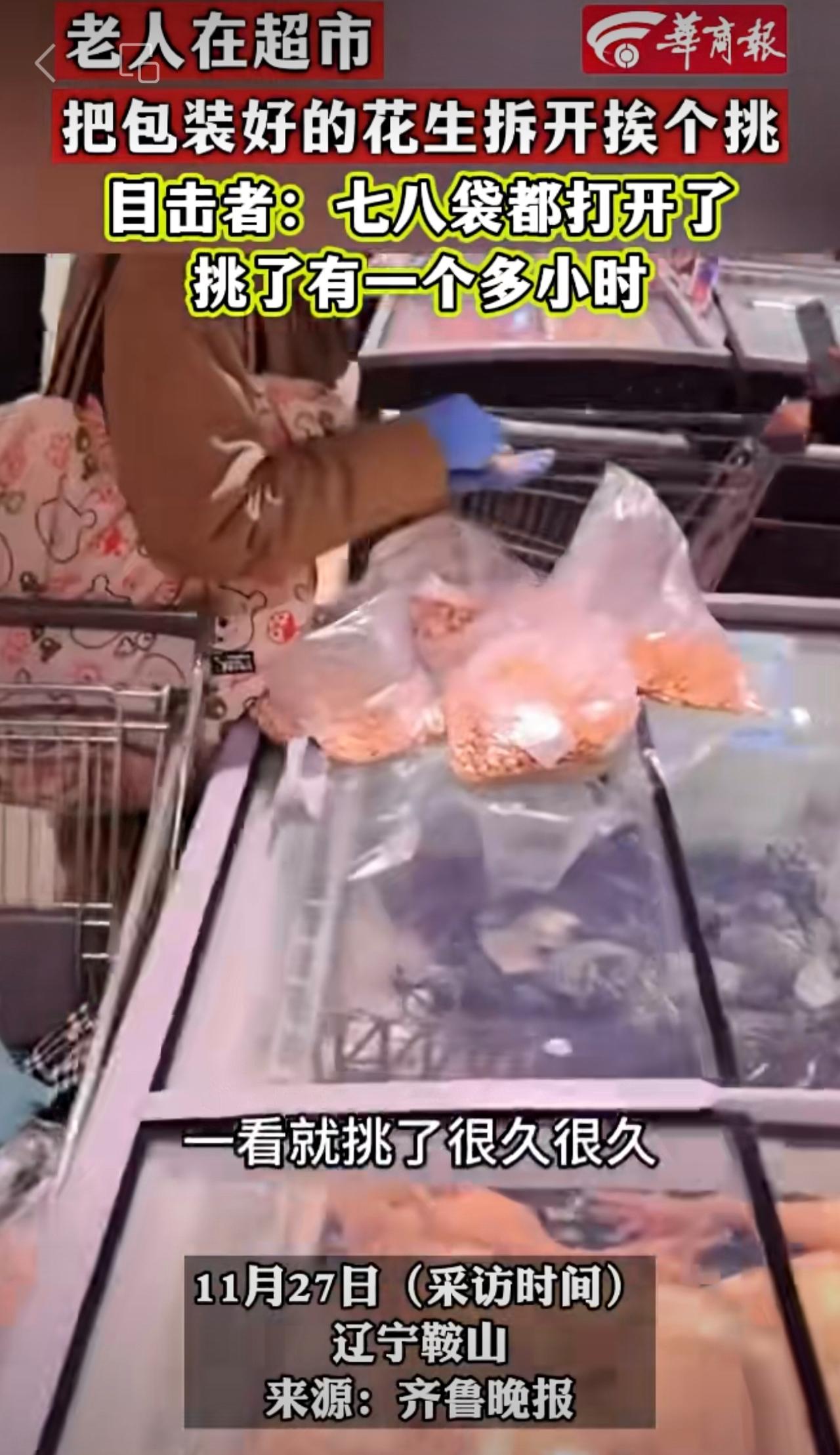 老人在超市把包装好的花生拆开挨个挑 目击者:七八袋都打开了挑了有一个多小时。