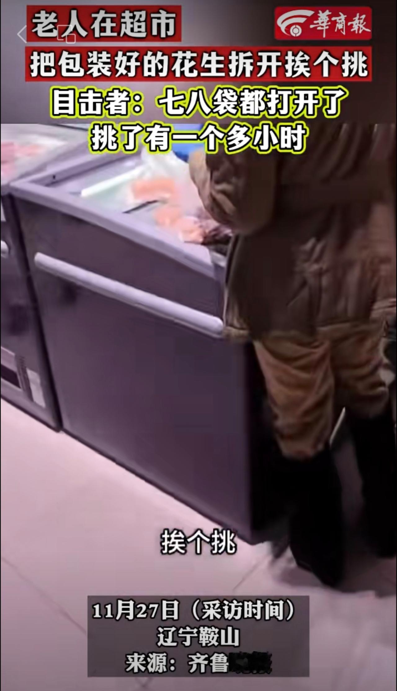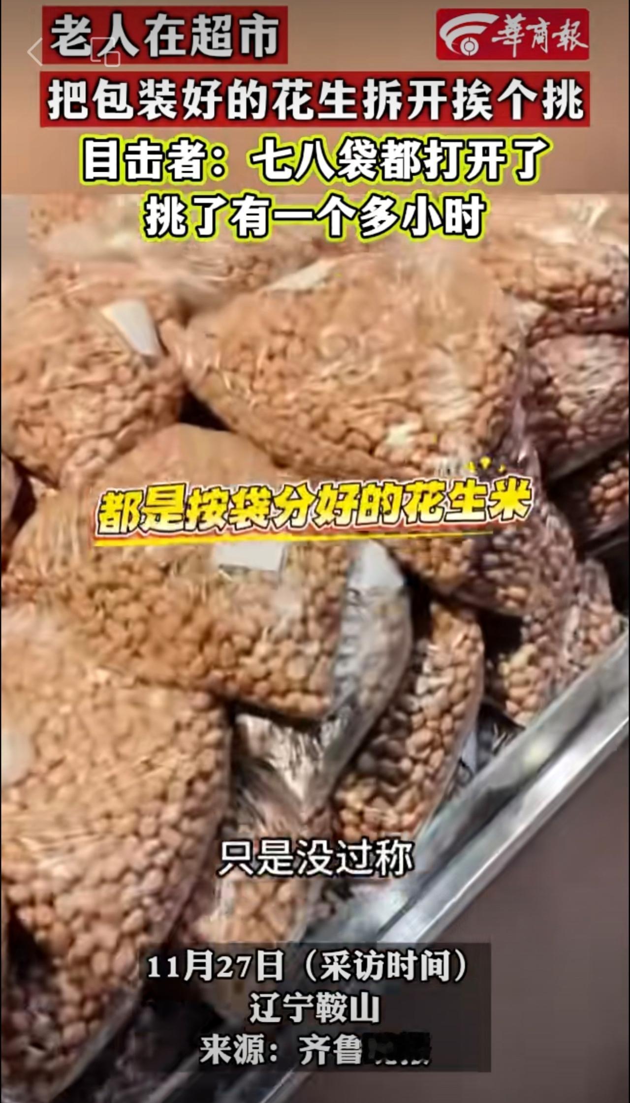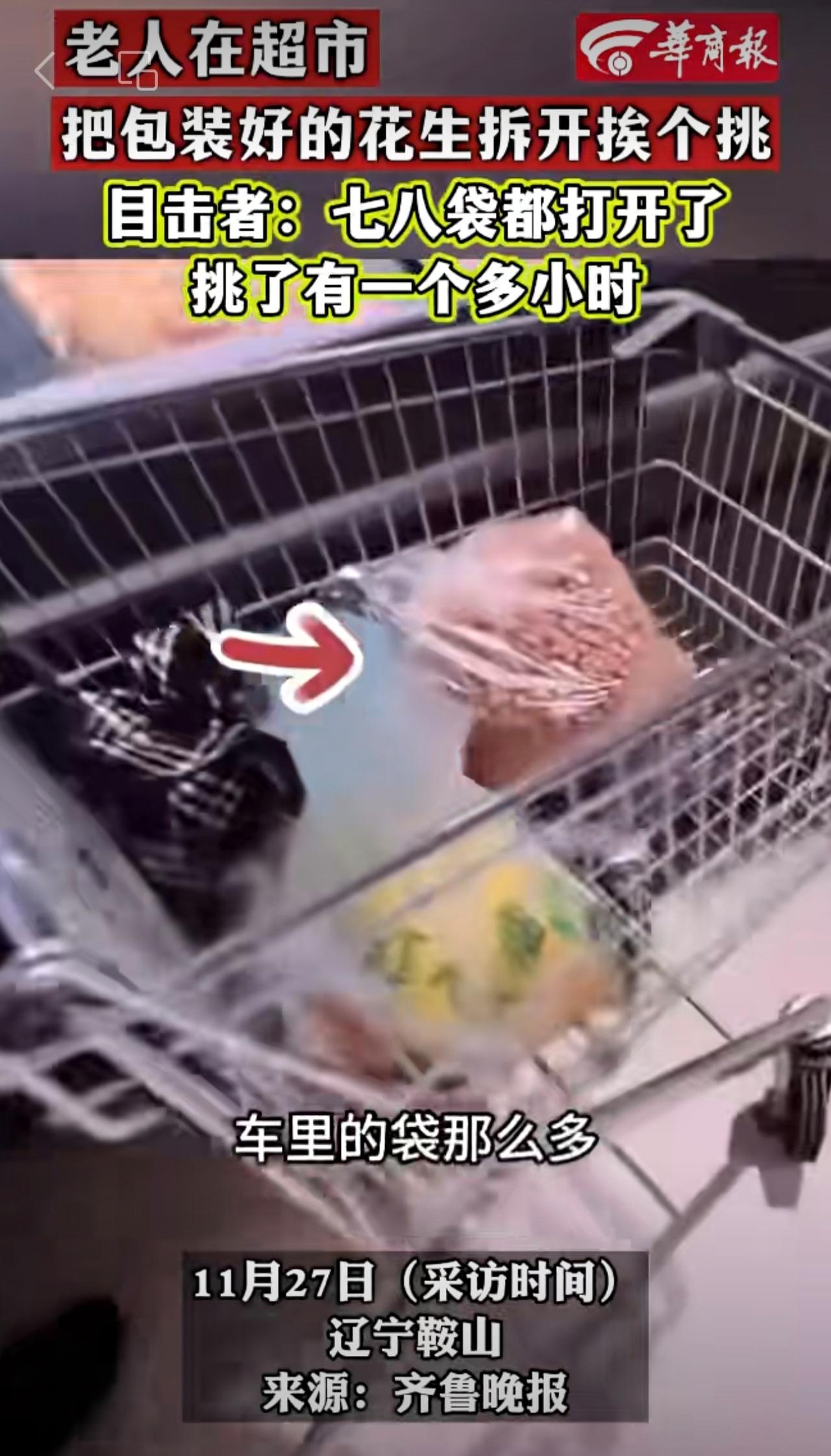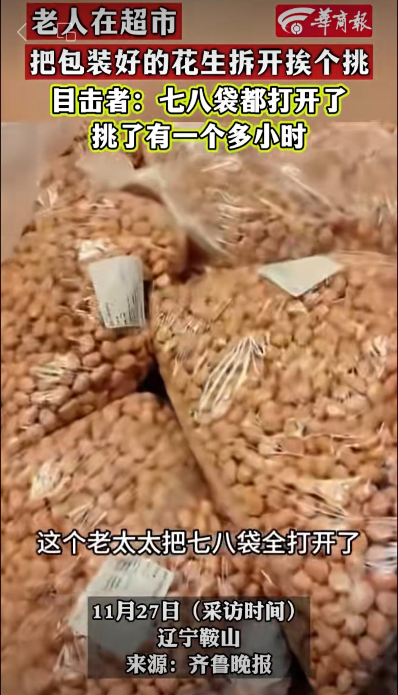 老人在超市把包装好的花生拆开挨个挑 目击者:七八袋都打开了挑了有一个多小时。