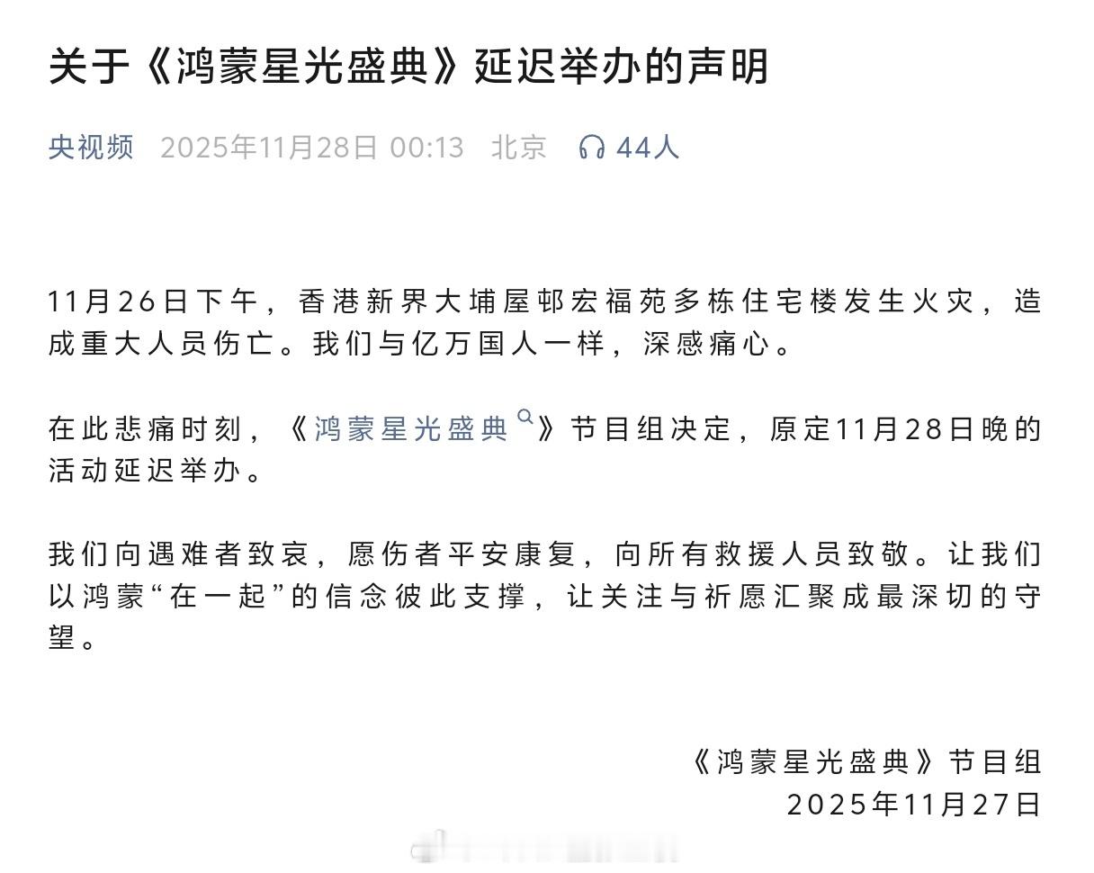 今夜最新:原定于今晚在央视财经频道和央视频直播的《鸿蒙星光盛典》将延迟举办。香港大火