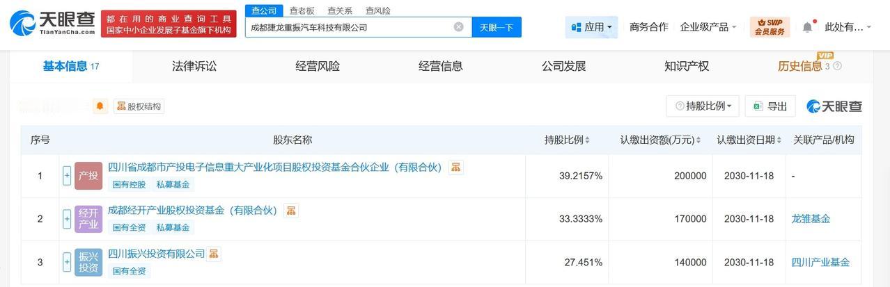 成都经开产业基金等成立汽车科技公司注册资本51亿 天眼查工商信息显示,近日,成都捷龙重振汽车科技有限公司成立,法定代表人为杨彦博,注册资本51亿人民币,经营范围为技术服务、技术开发、技术咨询、技术交流、技术转让、技术推广,新材料技术推广服务,企业管理,节能管理服务。股东信息显示,该公司由四川省成都市产投电子信息重大产业化项目股权投资基金合伙企业(有限合伙)、成都经开产业股权投资基金(有限合伙)、四川振兴投资有限公司共同持股。 天眼查信息: