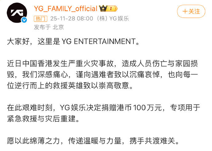 Kpop四大捐款现状SM:捐款100万港币YG:捐款100万港币HYBE:捐款5亿韩元(约266万港币)JYP:暂无任何行动HYBE发完悼念公告终于捐了,虽然捐的是韩国组织,虽然依旧模糊立场。。希望不是左口袋出右口袋进吧,下次能打清楚中国香港吗