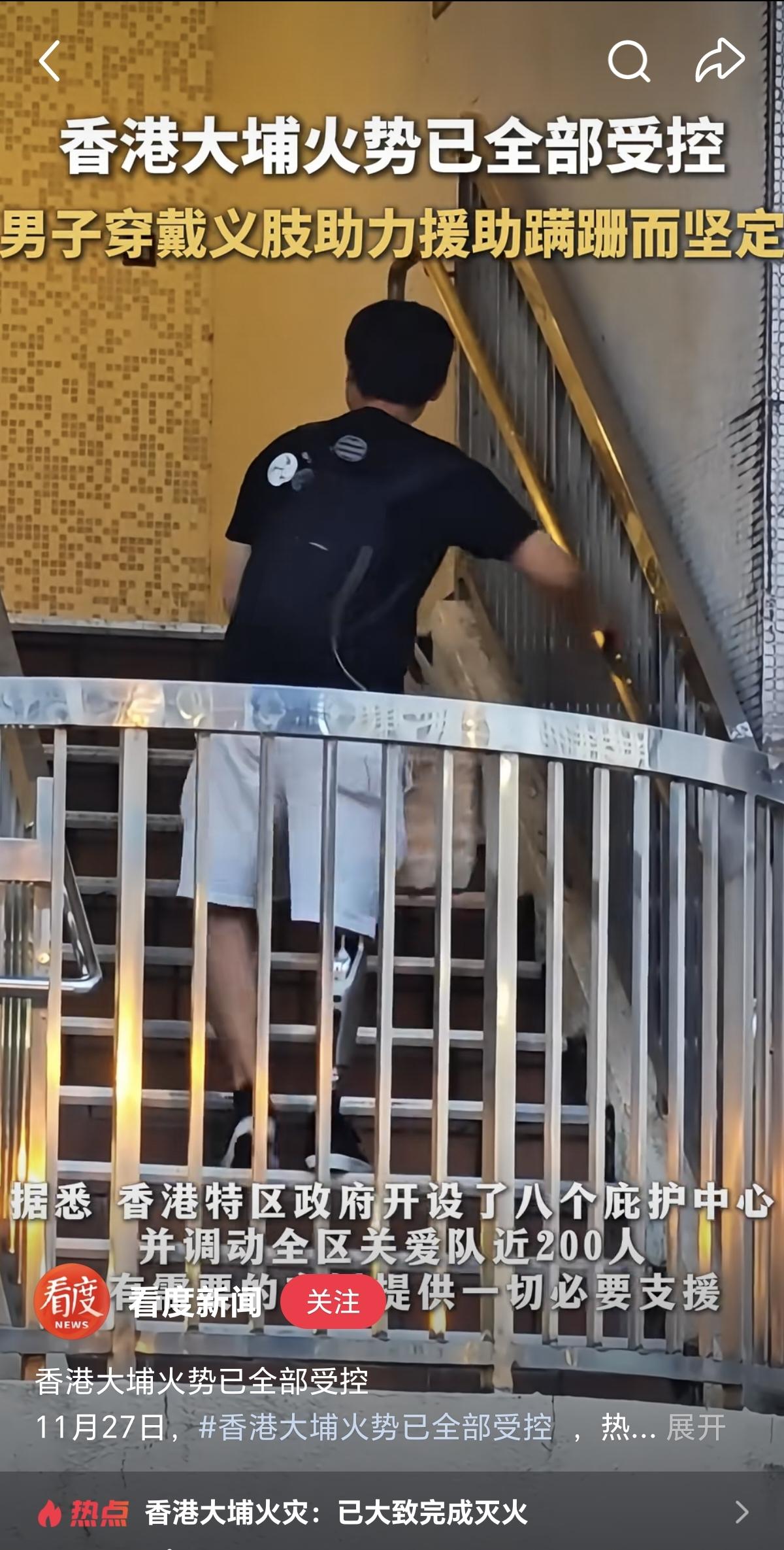 这两天香港那场大火,可把好多人的心都揪起来了。 现在火是灭了,可那些受灾群众才让人操心呢,他们有的没了亲人,有的打拼一辈子的家也没了。 眼下已经有好多人加入到救助受灾群众的事儿里了,有一幕真的特别让我感动😭 在救灾现场,有个戴义肢的小伙子,使着劲儿帮忙搬物资。他行动不方便,可还是尽自己最大的能力帮大家。每次灾难过后,都会有这样的大爱冒出来,真是火灾无情,人有情啊。希望那些失去亲人的人能早点从伤痛里走出来。