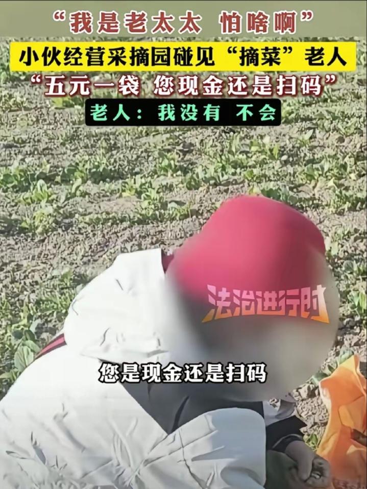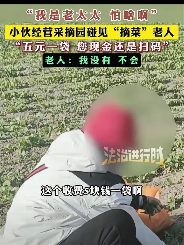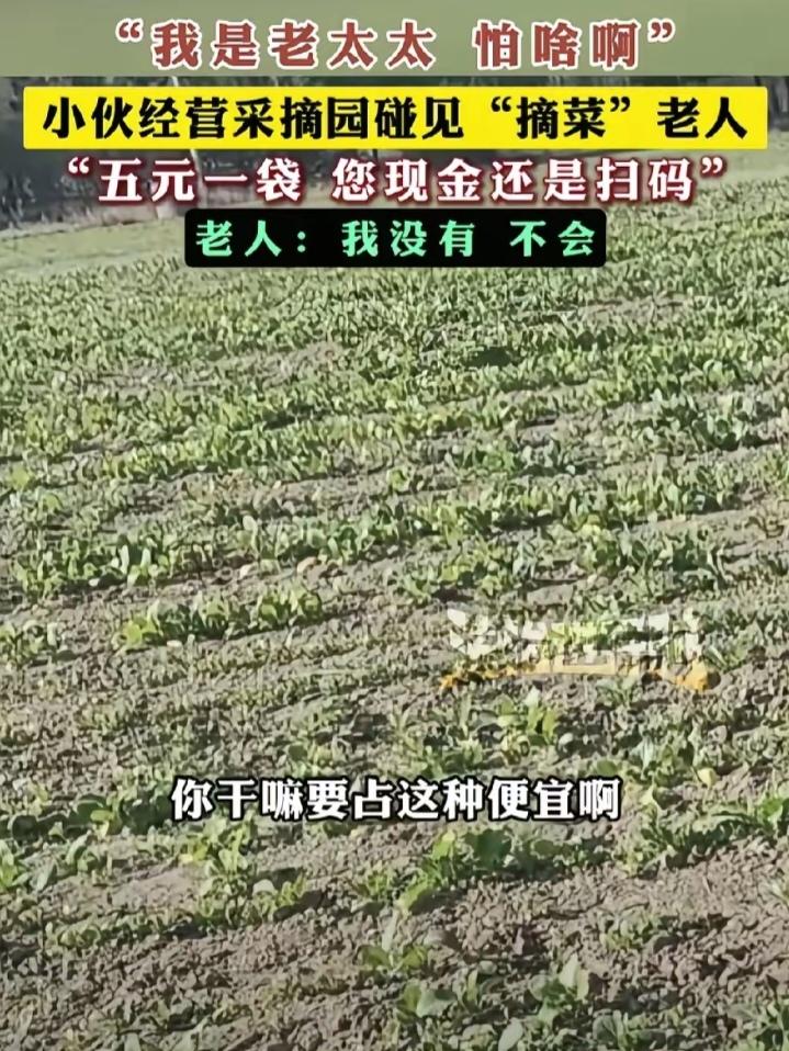 北京一小伙在自己经营的采摘园里碰见了一位老太太在偷摘自家的菜,就上前询问老太太:“您好,您是来采摘的吗?这个收费5块钱一袋,您现金还是扫码?”没想到老太太理直气壮的说:“我没有,不会。” 真没想到老太太会这么回答,真是活了一把年纪都白活了,就知道占别人的便宜,自己是一分钱也不想花,她就没想过这些菜也是别人辛辛苦苦种下来的,你这样做有尊重过别人吗? 小伙:“您花钱买好吧?” 老太太:“我70多岁了” 小伙:“您70多岁了,您欺负我农民,你干嘛要占这种便宜啊?” 老太太:“我是老太太,我怕啥啊” 老太太:“我也不是偷” 小伙:“您怎么不是偷,这不是您的菜,这是我的菜,您未经允许就是偷” 老太太的回答真是惊呆了,句句都在跟小伙明示暗示自己年纪大,要尊敬老人,还说他们牛栏山那边就允许自己采摘。 真是为老不尊,仗着自己年纪大,就想让别人处处都让着你,真是惯的毛病,也不知道跟谁学的。想让别人尊重自己,首先自己要学会如何尊重别人。 70多岁的年纪本应是让人敬重的长辈,可这位老太太的做法实在让人不齿。年纪大从来不是占便宜、不讲理的资本,反而活了大半辈子,更该明白做人的道理,懂得尊重别人的劳动成果。 小伙种点菜不容易,日晒雨淋的,凭啥要白白给你摘?牛栏山允许采摘,那你去牛栏山啊,别来别人的园子里耍无赖。尊重都是相互的,你不把别人的辛苦当回事,还想着仗着年纪耍特权,谁能真心敬重你?真正让人尊重的长辈,是明事理、守规矩,而不是拿着年纪当“免罪金牌”。各位读者你们怎么看?欢迎在评论区讨论。