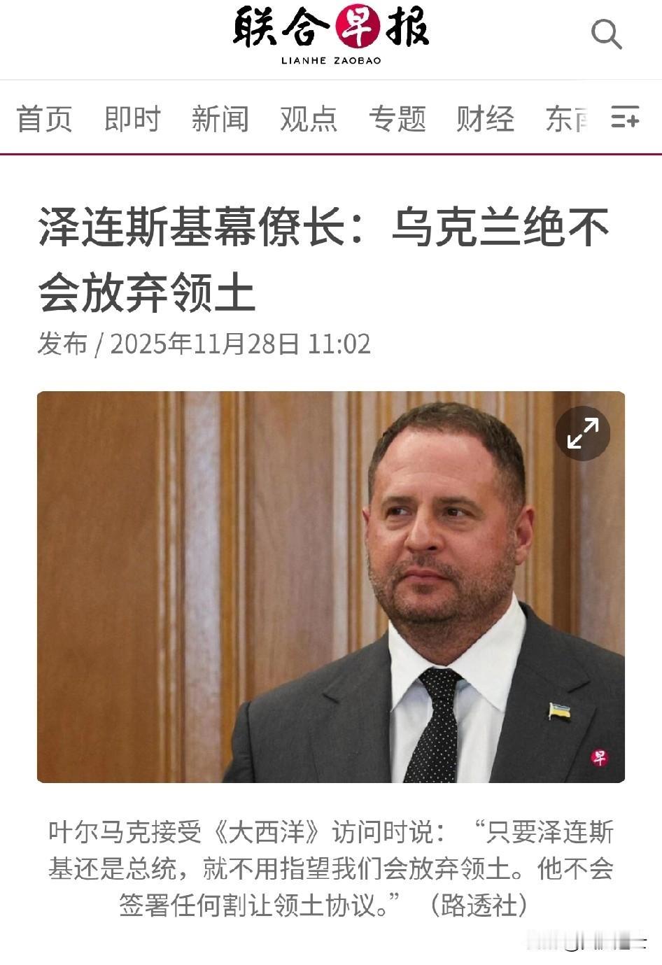 乌克兰总统泽连斯基的幕僚长叶尔马克说,泽连斯基绝不会同意以割让领土换取和平。 路透社报道,叶尔马克在《大西洋》星期四(11月27日)刊登的访谈中,强烈否认乌克兰会放弃领土,他说:“只要泽连斯基还是总统,就不用指望我们会放弃领土。他不会签署任何割让领土协议。”他说,目前唯一能讨论的就是划定接触线的位置。 基辅国际社会学研究所10月份发布的一项民调显示,54%的乌克兰人反对任何领土让步,即使这意味着战争将继续。 普京在11月27日的采访中说到,俄乌冲突只有在“乌克兰军队从他们占领的领土撤出”后才会结束,他说:“若乌方不撤军,俄方将继续通过军事手段实现目标。”