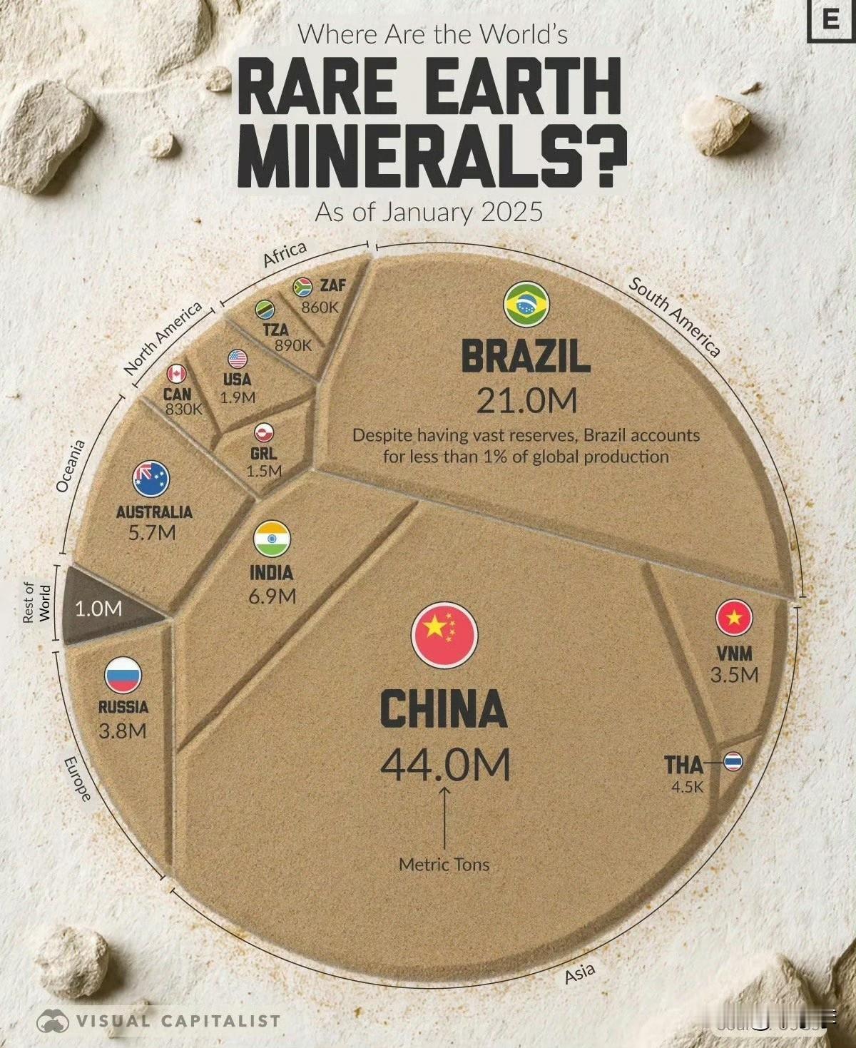全球稀土总储量达9200万吨美国地质调查局(USGS)数据表明,截至2025年1月,全球稀土总储量达到9200万吨。其中,中国以4400万吨的稀土储量占据主导地位,约占全球总储量的48%。巴西以2100万吨的储量位居第二,然而其稀土产量在全球占比仍不足1%。包括中国、巴西、印度(690万吨)、澳大利亚(570万吨)、俄罗斯(380万吨)和越南(350万吨)在内的前六大国家的储量合计约占总储量的80%。此外,美国拥有190万吨稀土储量,全球占比约2%。