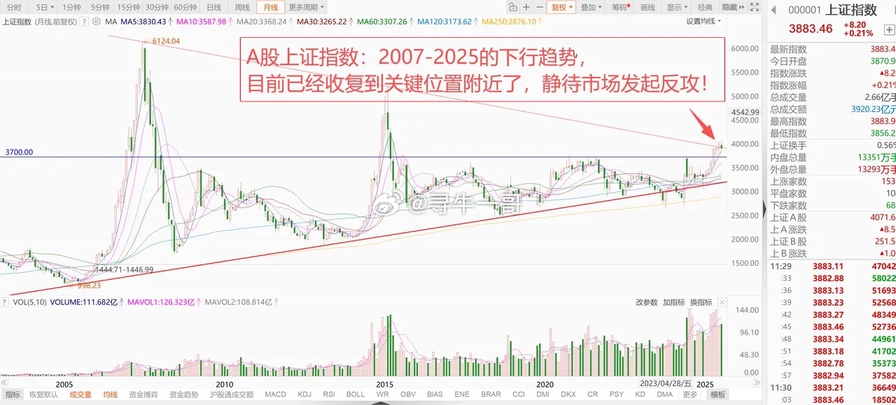 亚太股市走弱,A股各大指数全线普涨!为何却严重缩量? 1、亚太股市走弱,港股横盘涨跌分化 昨夜美股因感恩节假期休市,欧洲股市全线普涨,但是今天亚太股市走势偏弱。日经225指数开盘后,横盘水下震荡微跌,韩国股市小幅高开之后马上跳水,北京时间午间11点30分,跌幅达到1.24%。港股横盘震荡涨跌分化,恒生指数同样在11点30分微跌0.12%,但是恒生科技指数微涨0.28%。 2、A股4大指数全线普涨 A股不同于亚太股市的弱势,上证指数遭遇开盘下跌,上午十点开始震荡回升上涨,截止午间收盘微涨0.21%,收在3883点,虽然沪指涨幅不大,但是个股表现要好于指数表现。且截止午间收盘,深证成指、创业板指、科创50指数也全面上涨,涨幅分别为0.72%、0.71%、1.14%。 3、市场严重缩量!怎么看? 虽然各大指数普涨,量能还在继续大幅萎缩,本来近期都是在逐步缩量状态,结果今天还要比昨天还要大幅缩量。上午半天成交额都没有破万亿,仅9763亿,比昨天上午量能萎缩10%,半天缩量就达到了1123亿。市场还在延续观望情绪,但是做空力量已经明显减弱了,即便是如此缩量也能带动行情上涨,说明经过一段时间的洗盘,筹码趋于集中。 4、科技股回暖 上午还是科技类题材表现强势,低估值核心资产表现偏弱,作为科技的上游资源,有色板块上午涨幅居前,涨幅达1.47%,资源类仍然是后续主线行情之一。另外,半导体、工业机械板块涨幅居前,分别为1.31%和1.29%,昨天收评已经做到了重点提醒。近期科技股回暖的迹象非常明显。 综上所述,今天是11月的收官之战,而A股大盘上证指数从8月至今,洗盘长达三个多月了,这个过程中洗盘的中心在向上偏移,还突破了上行趋势。上周由于美股引起的全球科技股下跌回踩,导致A股再度跌破趋势,现在美股科技股已经恢复上涨,此前造成的杀跌需要被市场修复,目前修复只是时间问题。 静待股市新一轮的春暖花开!大盘a股今日看盘股票