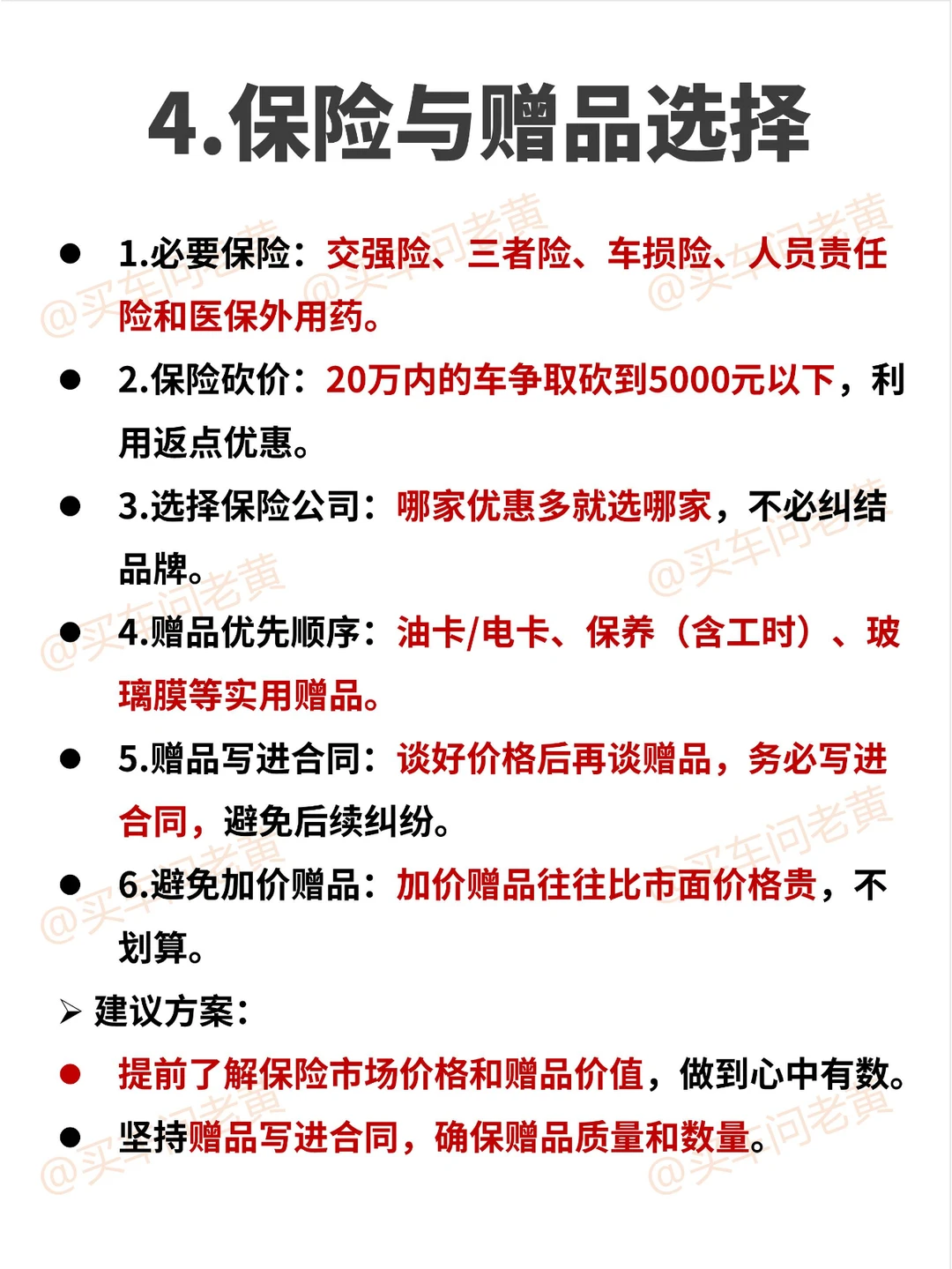保险得买,但别被宰。交强险、三者险、车损险这些必备,砍价也别忘了。赠品嘛,油卡、保养、玻璃膜这些实用的才是硬道理。记得,赠品要写进合同,别到时候空欢喜一场!