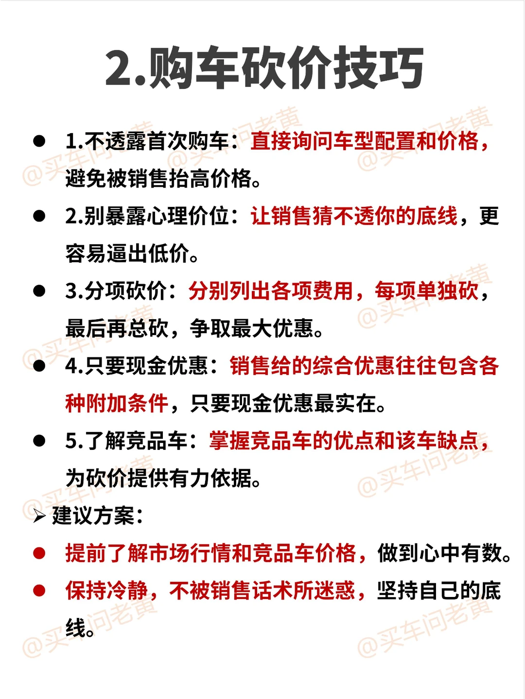 砍价时,记得别露怯,直接问价格,别急着说自己的心理价位。让销售摸不清你的底细,他们才不敢轻易报价。费用一项项砍,最后再来个总价砍,保证你能拿到心仪的价格。销售要是给你综合优惠,记得坚持只要现金,附加条件可别轻易答应!