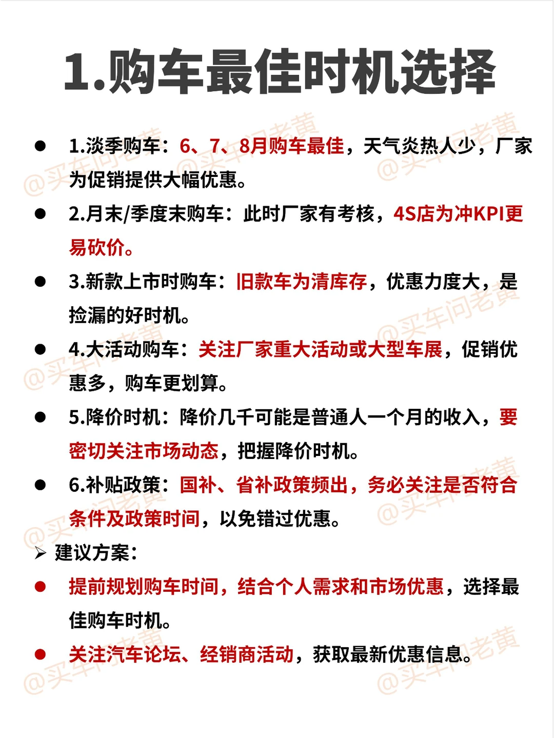 你知道吗?买车也有“黄金期”。6、7、8月这几个月,天气热得让人只想宅家里,购车的人少了,厂家为了促销,优惠力度可大了去了。还有月末、季度末,4S店为了冲业绩,砍价更容易哦。新款车型上市时,旧款为了清仓,价格也是“跳水式”下降,捡漏的好机会可别错过!