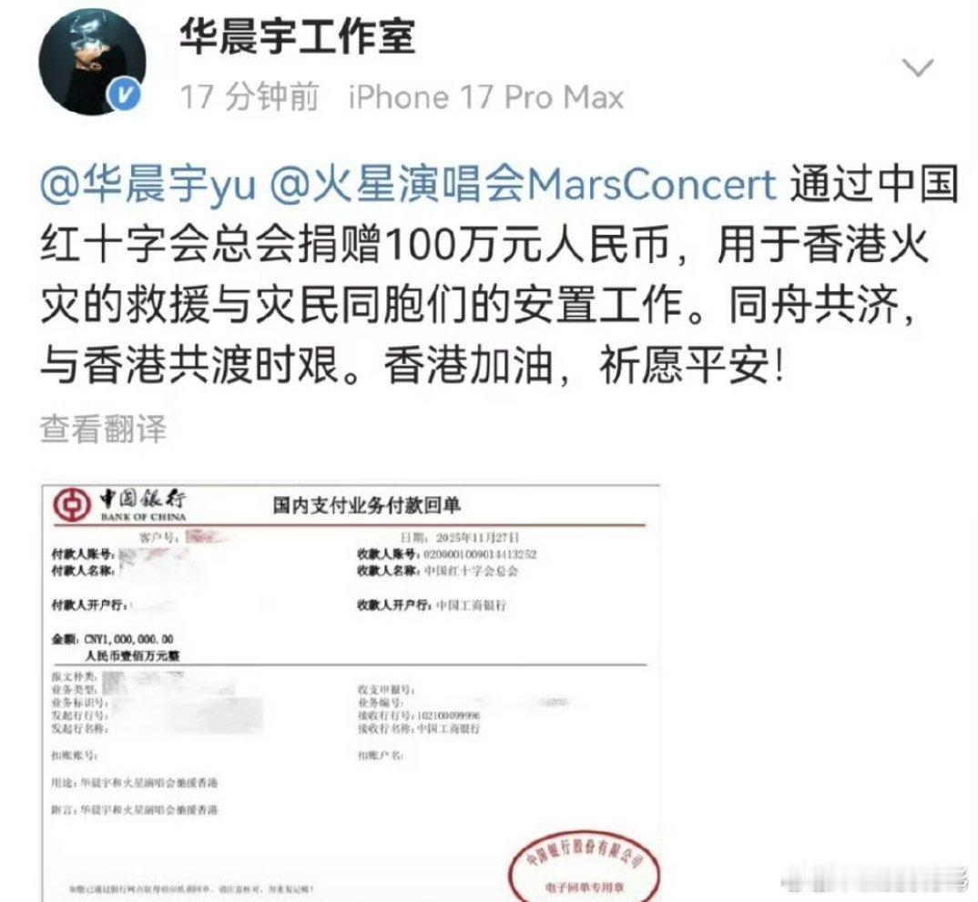 华晨宇给香港捐赠100万 他在音乐上一直有自己的坚持,在公益上也从不缺席。每一次伸出援手,都是在传递温暖和希望,这样的正能量值得被更多人看见和学习。