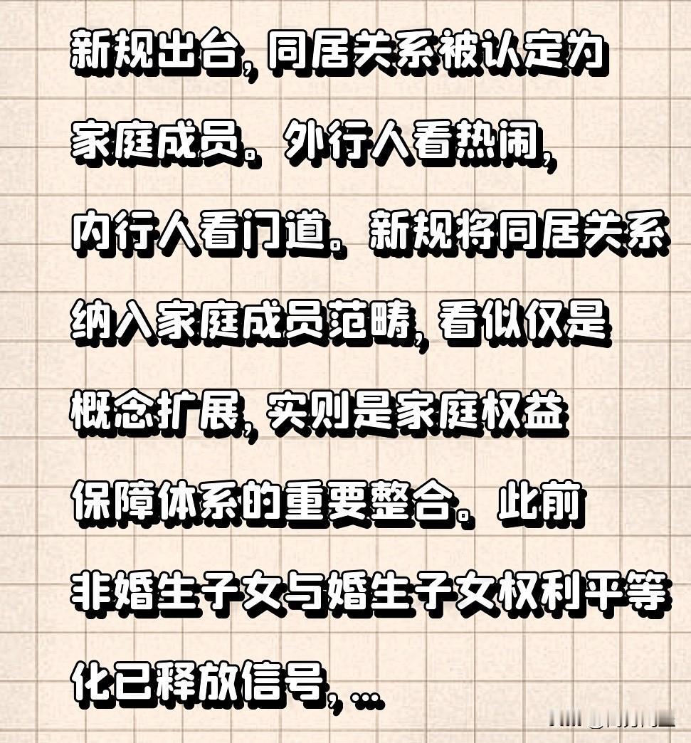 同居关系认定为“家庭成员”背后的秘密 新规出台,外行人看热闹,内行人看门道。 老一代人视同居为非法行为,大多数传统观念对同居予以排斥和否定,称此种行为为“非法同居”。 如今时代不同了,当今社会确实存在着非婚同居、单亲家庭等多元社会结构,涉及到继承、抚养等民事权利义务的界定。 最高检发布新规,将同居关系纳入家庭成员范畴,看似仅是概念扩展,实则是家庭权益保障体系的重要整合。 法律正从形式婚姻转向实质共同生活作为认定标准,不仅对继承,抚养等民事权利重新配置,更意味着家庭暴力、社会保障等公法保护范围同步扩大。 其实,在若干年前,非婚生子女与婚生子女权利平等化已释放信号,本次新规进一步突破传统家庭界定,形成了逻辑闭环。 整套规则重构体现了立法对现实生活复杂性的跟进,推动家庭法治理念从身份登记主义向关系实质主义的深层转型。 同居关系认定为家庭成员,按婚姻法管理,同居双方的责权利,有关抚养,继承等事项就能有法可依。 友情提示:同居关系也需要谨慎对待。