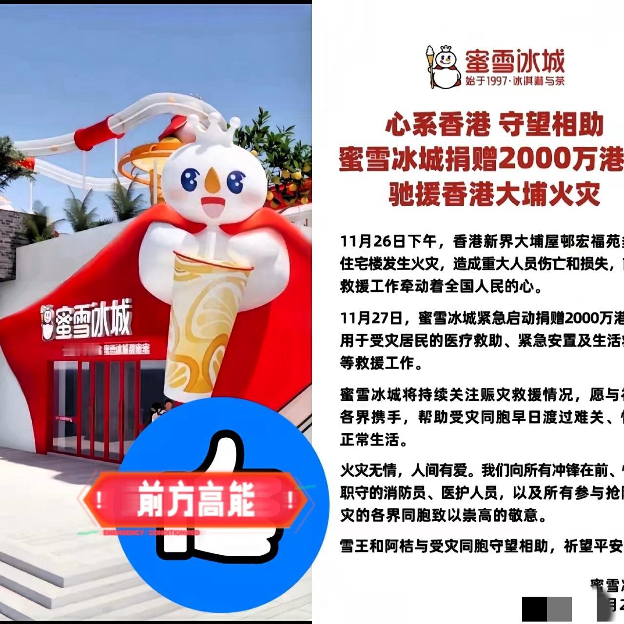 腾讯捐款3000万港元我不意外 霍启刚家族捐款3000万港元我也不奇怪,但我真的万万没想到,小小的蜜雪冰城居然也能捐2000万港元驰援香港! 要知道它一杯柠檬水才4块钱,这2000万港元得卖近500万杯才能凑够,每一分都是实打实的辛苦钱! 可这不是雪王第一次发力,西藏地震捐1000万、河北北京抗汛捐1000万、教育和科研领域也动辄千万投入,公益从来不是一时兴起! 低价不代表格局小,蜜雪冰城用行动证明,民族企业的担当从不是看利润高低,而是看是否愿意回馈社会。它把消费者的每一份信任,都变成了温暖他人的力量,这才是最动人的品牌底色。 你最近喝过蜜雪冰城吗?对于这种"低价高担当"的企业,你愿意主动支持吗?