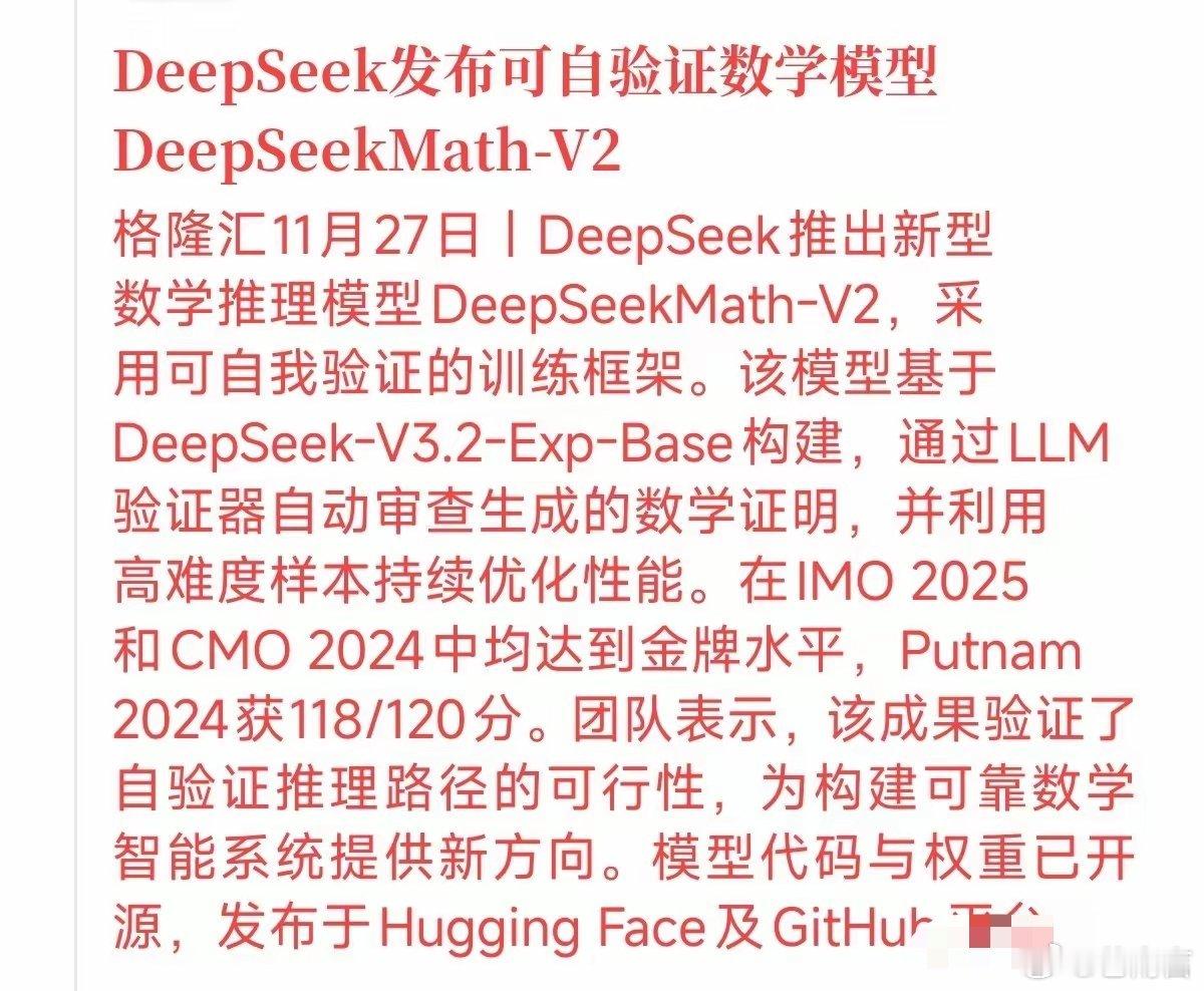 DeepSeek推出新模型DeepSeek数学模型夺冠!看到DeepSeek新推出的数学模型DeepSeekMath-V2在IMO、CMO竞赛中斩获金牌,Putnam竞赛更是拿下118分(满分120),这实力直接碾压人类学霸!🤯更厉害的是采用“自我验证”框架——模型自己出题自己改卷,就像炒股AI既能推荐个股又能判断买卖点,可靠性大大提升!对咱小散的启发:1️⃣ AI大模型竞赛进入新阶段,技术突破超预期2️⃣ 开源策略可能加速行业应用落地3️⃣ 但别追高!等回调布局真正有技术的公司重点关注与DeepSeek合作或有类似技术的A股公司,宁可错过也不追高!你们觉得AI股还能炒第二波吗?