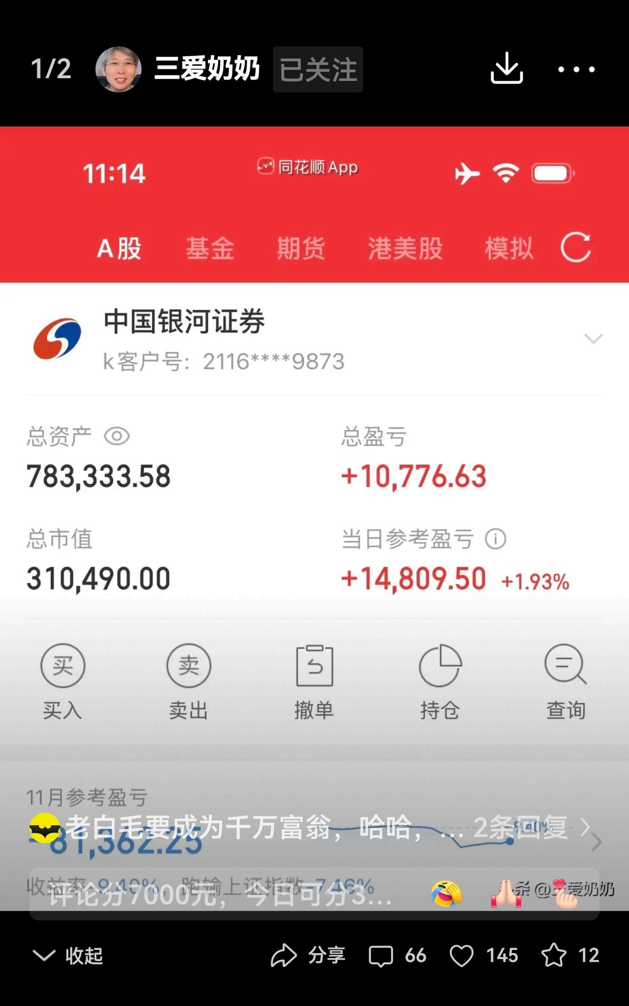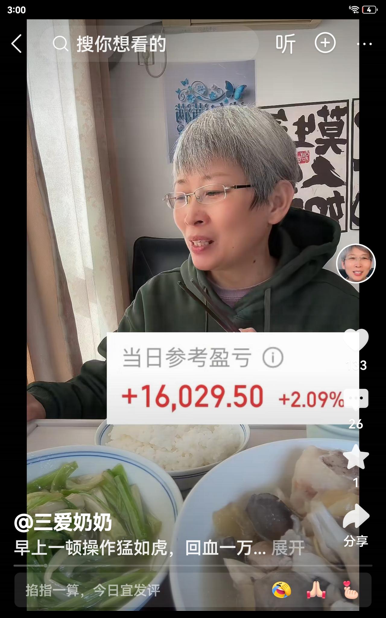 奶奶精神抖擞,股票价格回升,账户里多了一万六千多元,余额再度上涨。尾盘时,她又买入了无人机的股票,这次没有全仓投入,余钱买进了逆回购,奶奶变得有些谨慎了。 中午,“8+1”安排上,奶奶炖了一锅猪蹄肉皮煲,好好地补充胶原蛋白。怪不得奶奶皮肤保养得这般好,原来秘诀就在这儿。奶奶不仅厨艺精湛,炒股也颇有心得,真得向奶奶学习。
