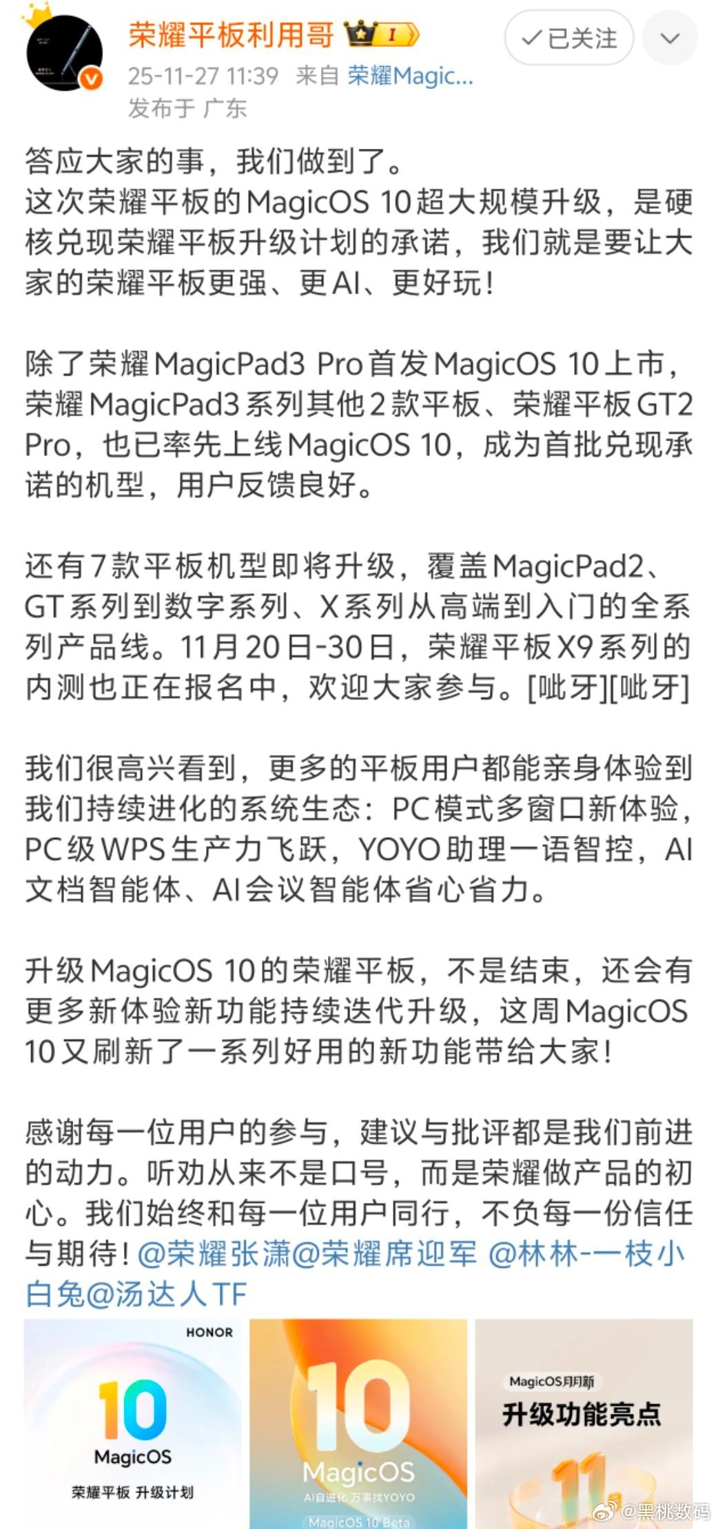 荣耀MagicPad3ProMagicOS10 荣耀平板这次MagicOS 10大动作升级,是真实打实兑现平板升级计划的承诺。现在更多荣耀平板用户都能实打实感受到,YOYO助理一句话就能搞定操控,还有AI文档、AI会议智能体,省时又省力。