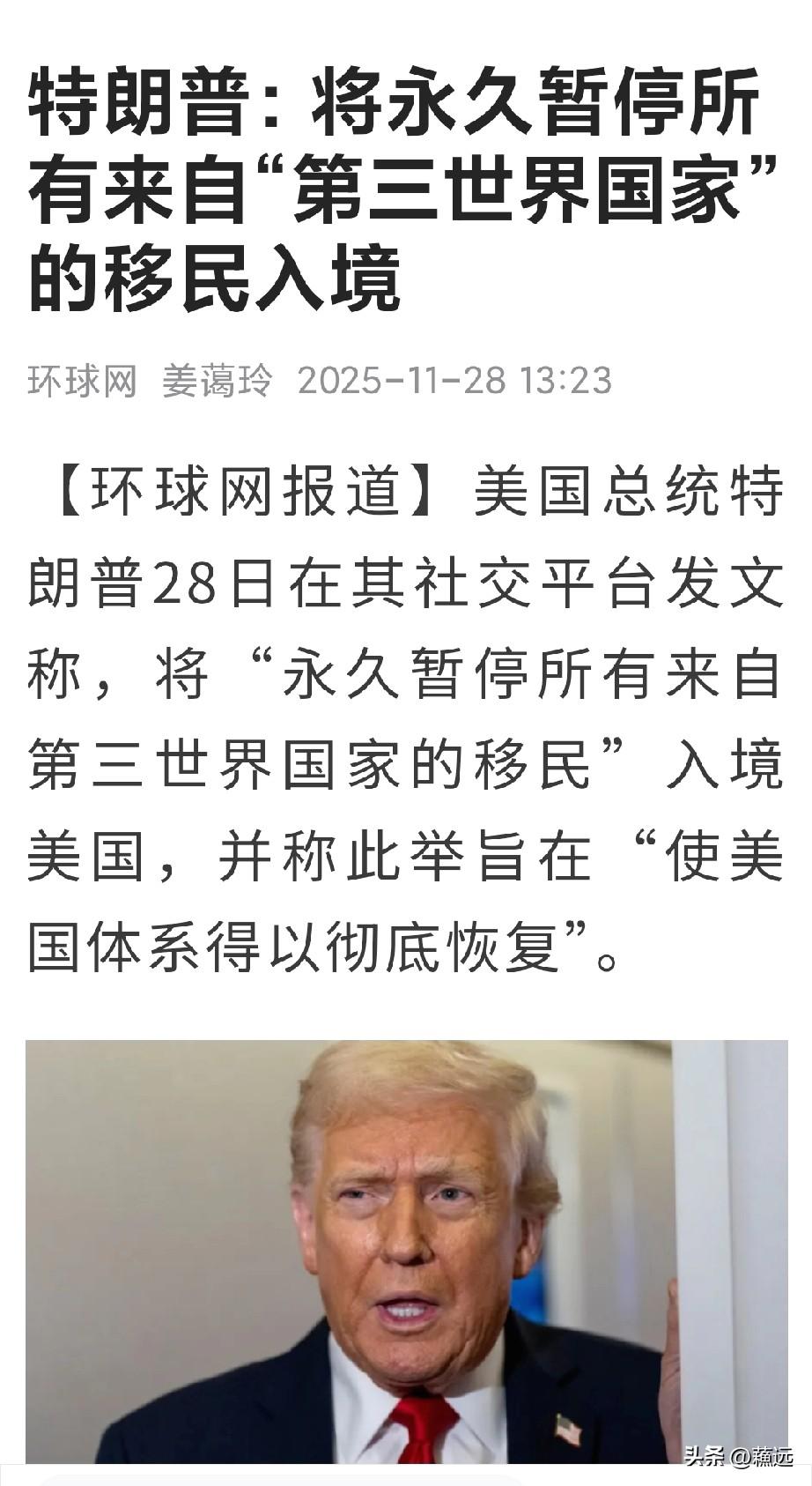 特朗普推特发文:永久暂停所有来自第三世界国家的移民。 中国属于第三世界,是不是说从即日起那些想通过投资、婚姻、服务、职业等渠道想移民美国的人,从这一刻起都会被拒?但是,坚信美国绝不会拒绝“巨额利益输送、有名政治人物避难、窃取绝密情报和掌握最新技术”的人投美,不仅不会拒绝,还会积极争取,敞开怀抱。