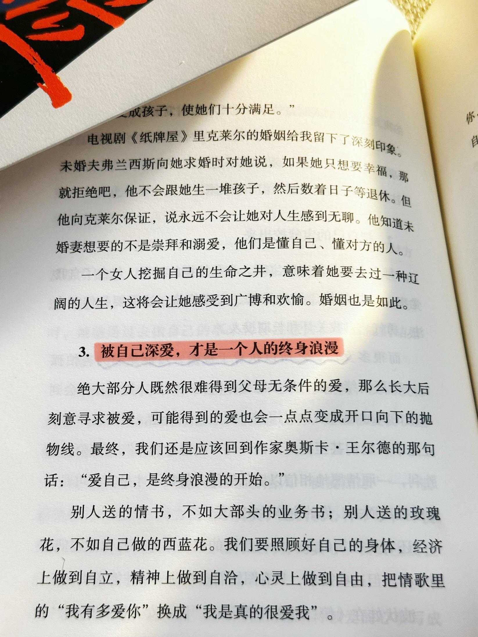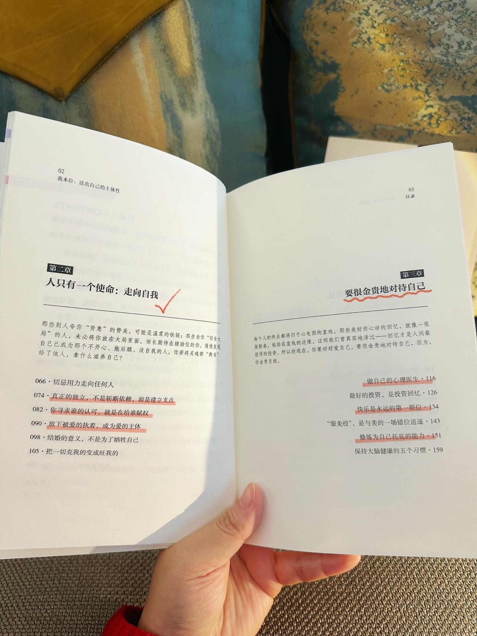 再次被这本书狠狠治好了我的焦虑和软弱,活出了自己的主体性。一个女生开始变强的征兆:建立我本位思维。我永远是我人生的主线。我永远忠诚于自己的感受、自己的事业、自己的人生。
