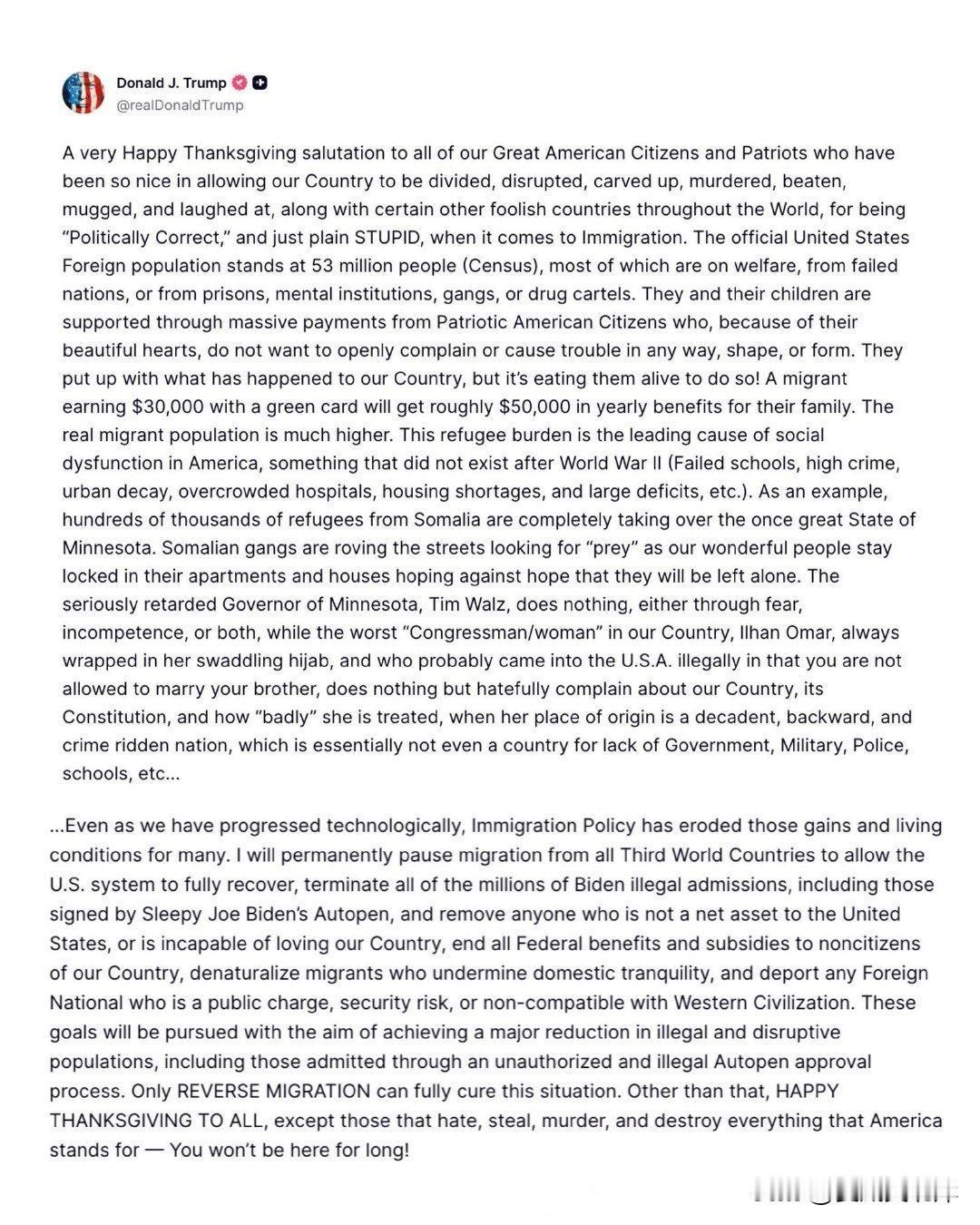 川普宣布将永久禁止第三世界国家的移民。 “我将永久暂停来自所有第三世界国家的移民,让美国系统完全恢复; 终止拜登政府数以百万计的非法入境许可,包括那些由“瞌睡乔”拜登用自动笔签署的; 驱逐任何对美国不是净贡献、或无法热爱我们国家的人; 终止所有联邦福利和补贴给非公民; 剥夺那些破坏国内安宁的移民的国籍; 驱逐任何成为公共负担、安全风险或与西方文明不兼容的外国公民。”